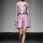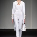 In passerella bluse in organza combinate con shorts, tute sormontante da leggeri spolverini, tubini, gonne, pantaloni e giacche dalle linee rigorose con comun denominatore dettagli dalle forme geometriche e numerose proposte con scollo all’americana.