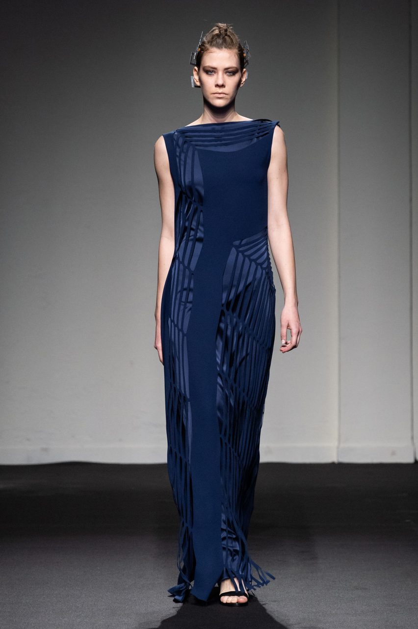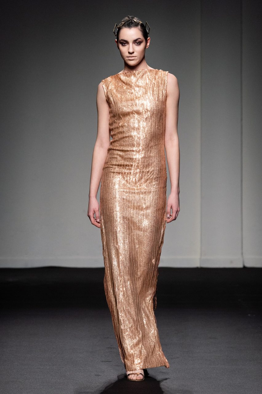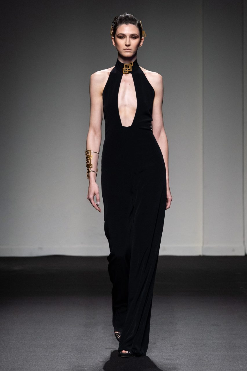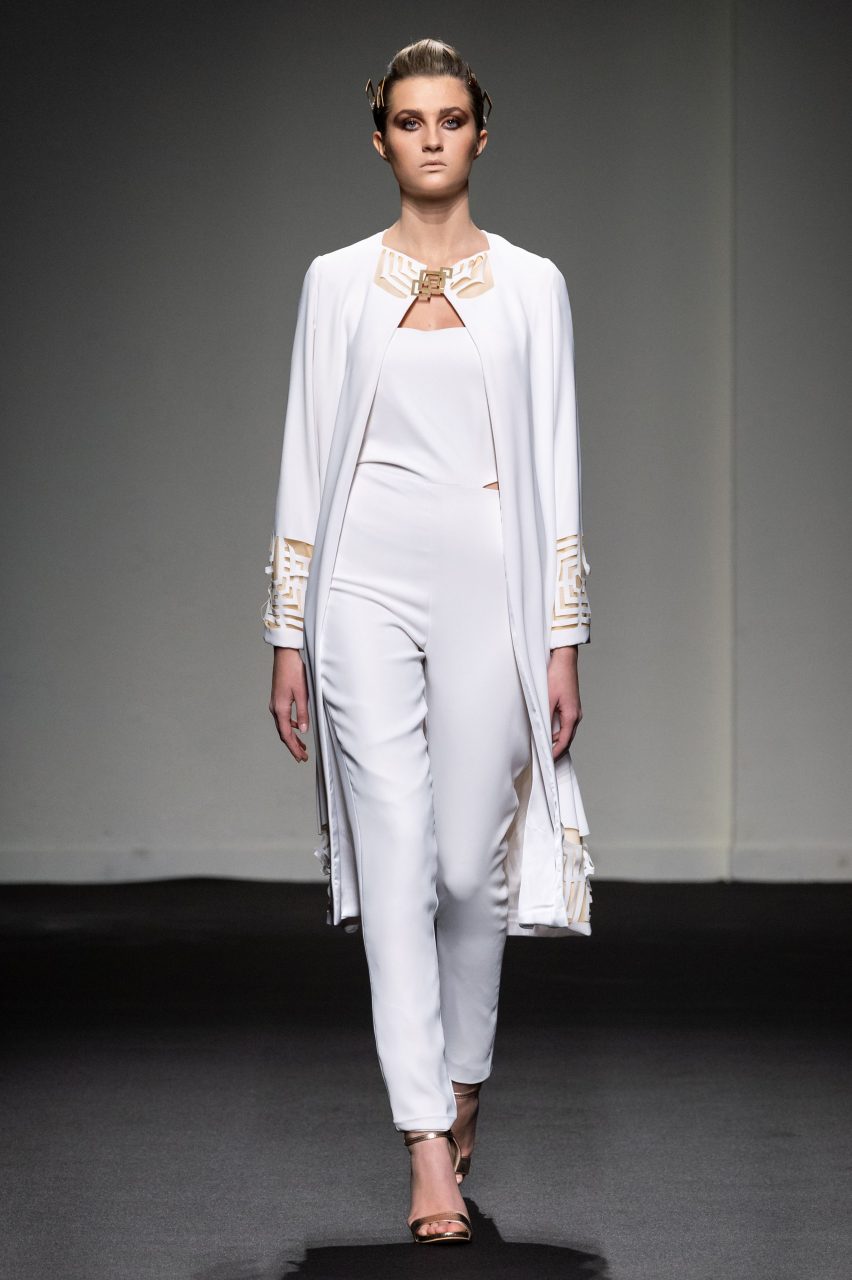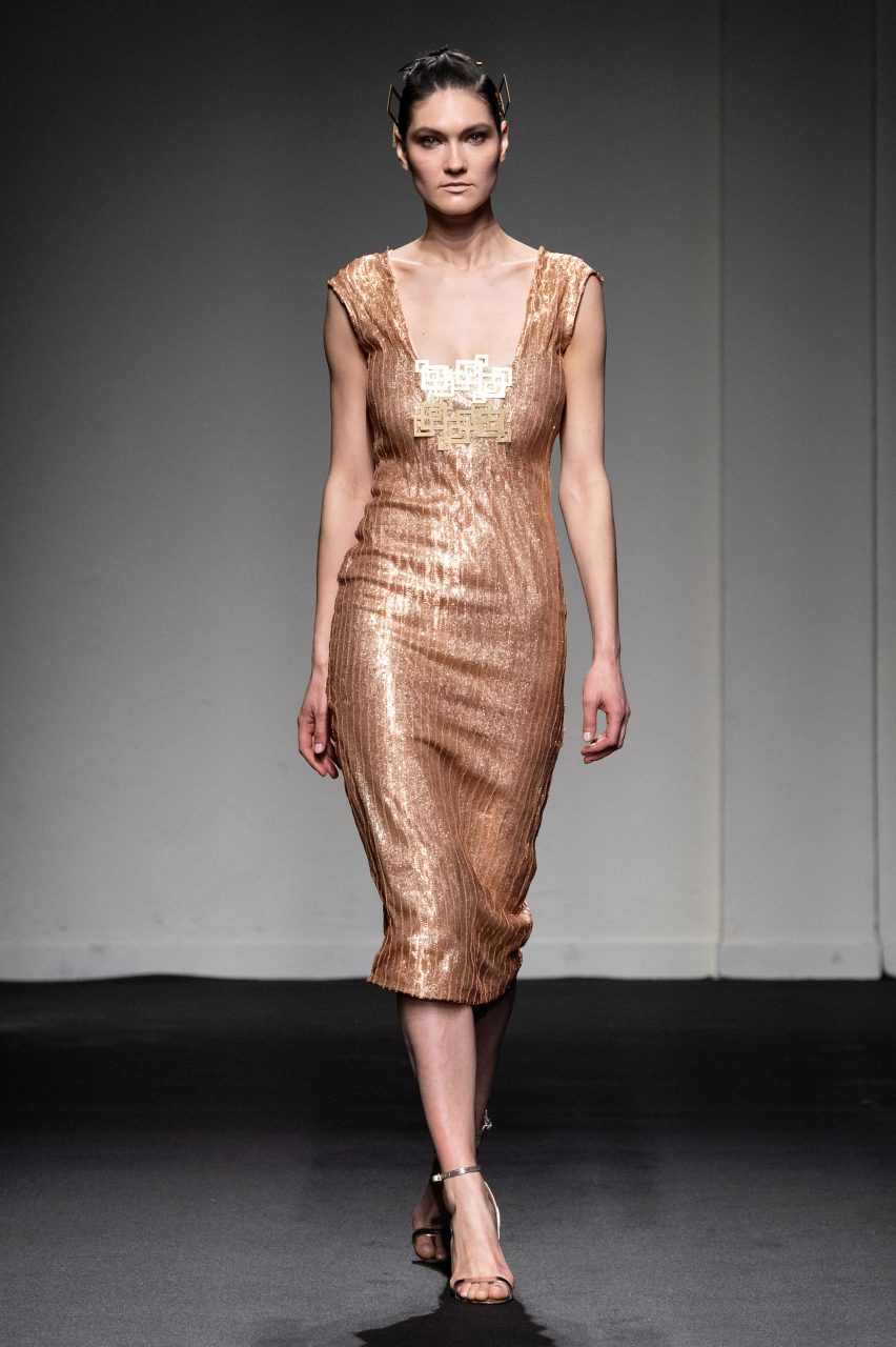 Donne di una femminilità sensuale ed assertiva che la designer esprime proponendo una collezione che celebra uno stile elegante dove ci si veste per sedurre e ci si copre per proteggersi. Ad enfatizzare l’aspetto marziale delle guerriere ci sono le acconciature con capelli morbidamente raccolti da fermagli metallici per emulare eleganti elmi a protezione del capo.