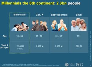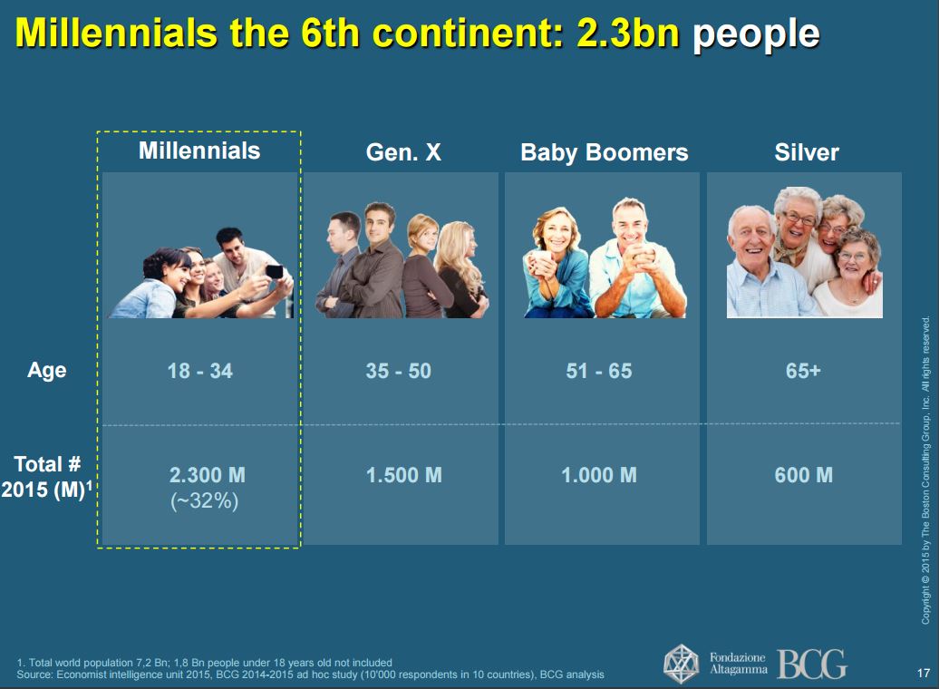 Le aziende del lusso dovranno fare i conti sempre più, nei prossimi anni, con consumatori dai gusti, esigenze, profili molto differenziati. Su tutti si impongono i Millennials, persone di età compresa tra i 18 e i 34 anni, sparsi in ogni continente ma con alcune caratteristiche in comune, ad esempio l’attenzione alla sostenibilità ambientale e la sensibilità ai temi etici. Oggi nel mondo vivono 2,3 miliardi di giovani e l’85% di essi risiedono in Paesi in via di sviluppo: molti di costoro domani saranno acquirenti di beni d’alta gamma, a cominciare dai Cinesi.