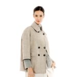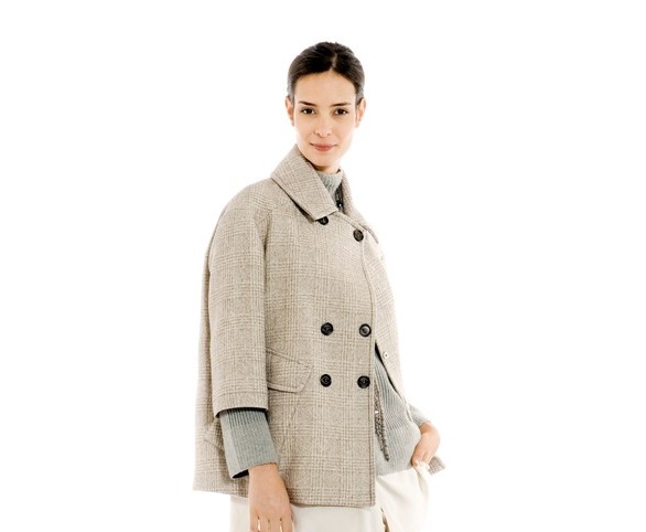 La proposta del piumino è ridotta. Quando c’è i materiali sono invertiti: l’interno è in nylon l’esterno in flanella di cashmere. Lo stesso succede nel montgomery di montone con nylon interno e bottoni in galalite. Lo scuba, la t-shirt da immersione, è proposta in lana e cashmere.