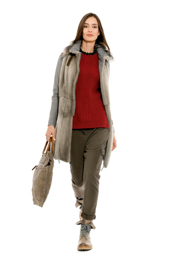 Visone lavorato a tricot, ma taglio da t-shirt, leggero come una piuma; se poi lo si taglia come un bolerino abbiamo ancora un capo da sera da portare con una tunica o con pantaloni ampli morbidissimi. Mongolia, volpe e marmotta come dettaglio aggiunto nei colli di cappotti, bomber e montgomery.
