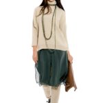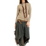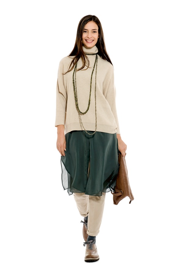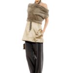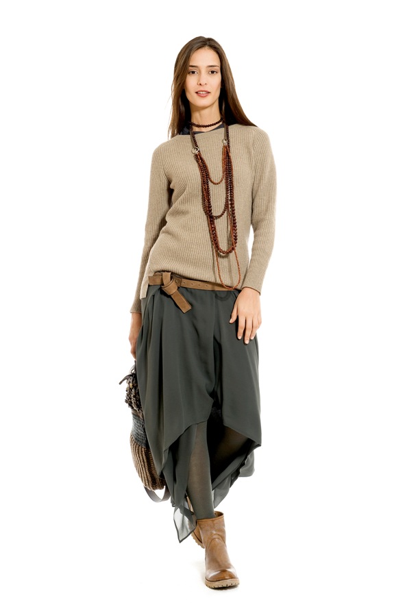 La maglia diventa quindi più importante per l’autunno-inverno 2010-11, più preziosa specie nell’elaborazione. Le trecce rendono il capo ricco, ma se si aggiungono dettagli che richiamano il gioiello e addirittura lo sostituiscono allora possiamo dire che siamo di fronte ad un capo da sera anche se in partenza si tratta di un “rozzo” maglione. Così succede nella maglia di stile norvegese, arricchita di pailletes, lavorata con il filo diamante -cioè quello con la paillettes già sul filo-, a cui è stato aggiunto un filo di oro bizantino da portare con una gonna o un pantalone in seta: da Cucinelli c’è un capovolgimento di prospettiva. La “sera” diventa rustica.