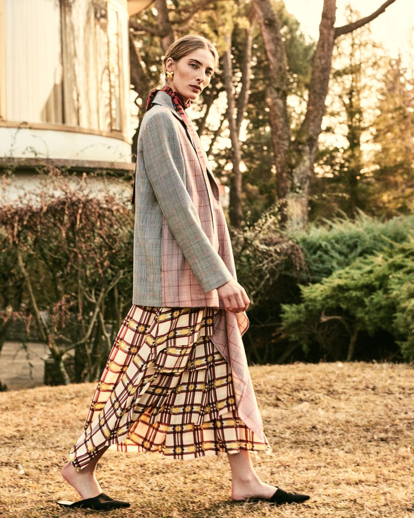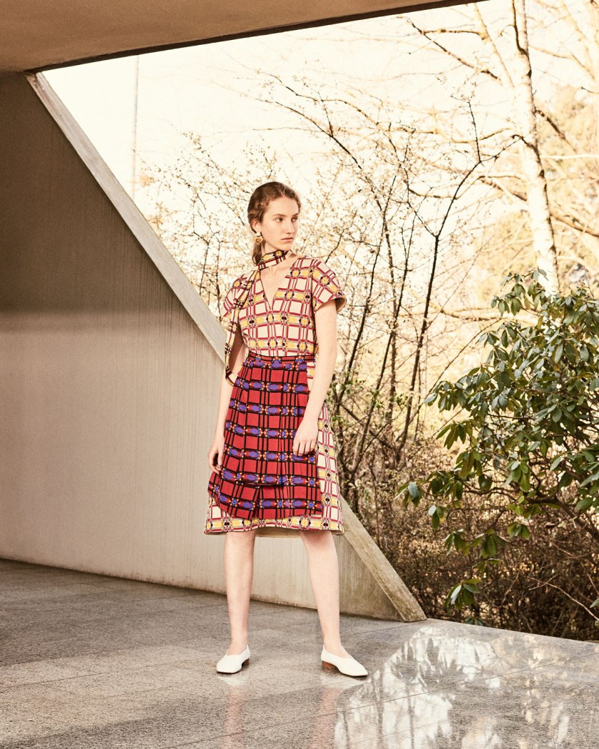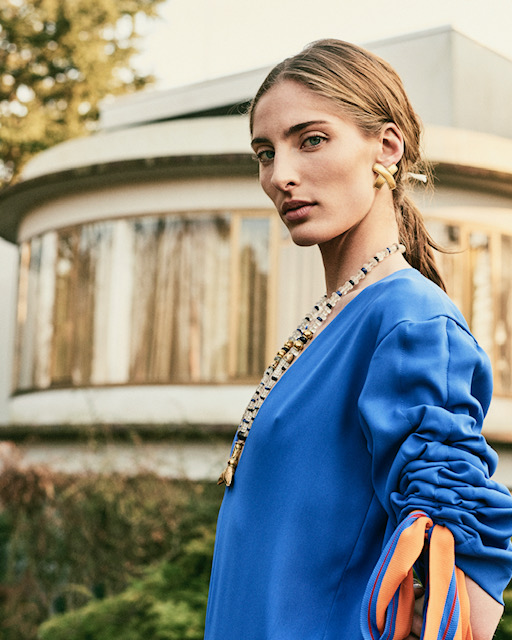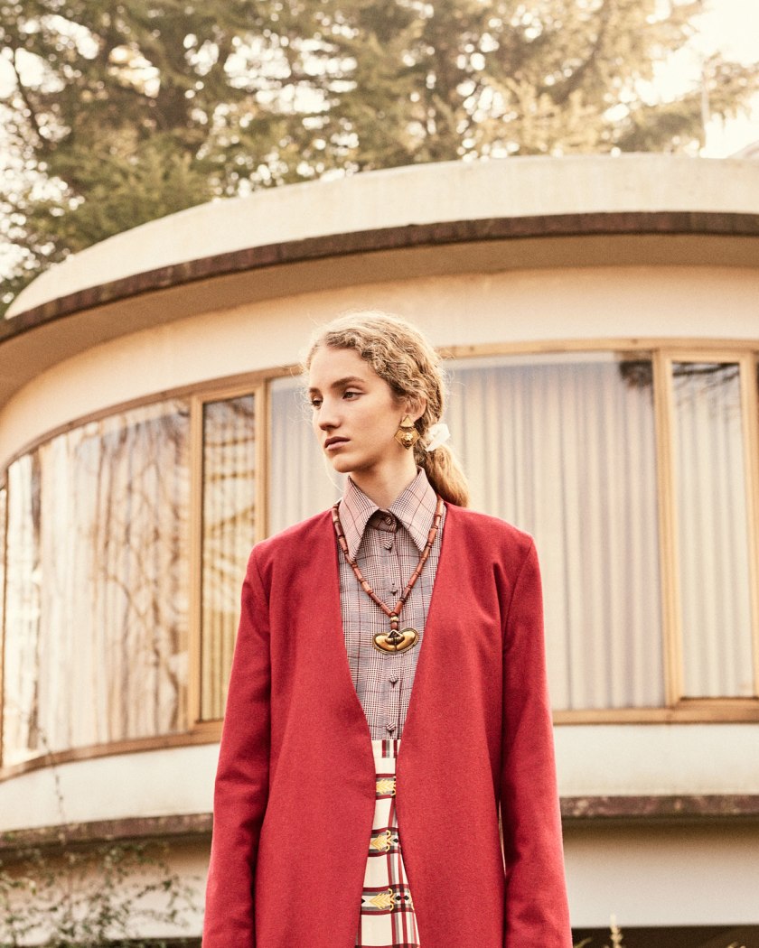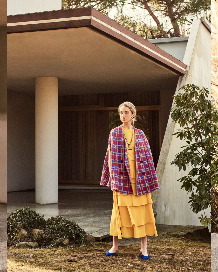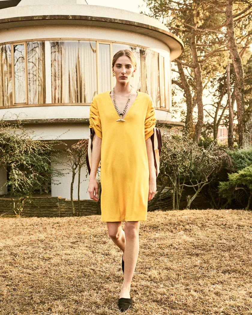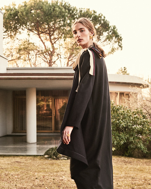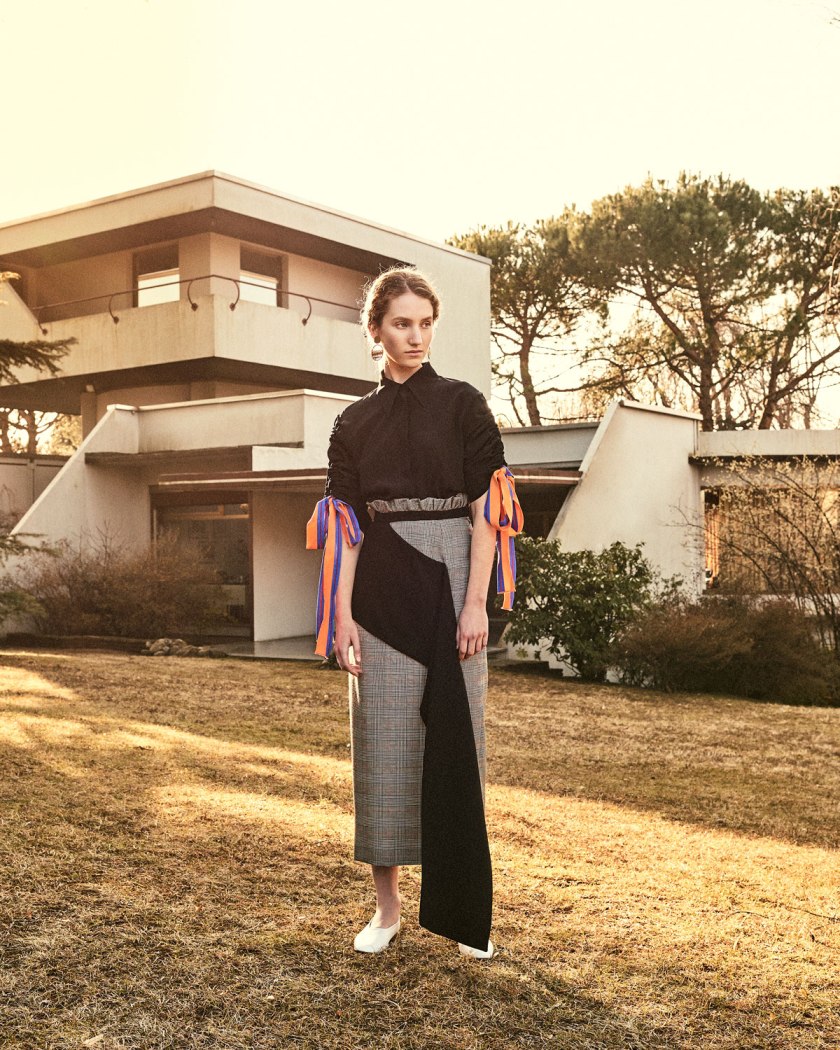Uno stile definito e per questo riconoscibile, che ritroviamo nella collezione presentata all’interno del calendario della MFW di febbraio 2019 nelle sale del Museo Bagatti Valsecchi dove, oltre agli abiti su manichini, vengono proiettati gli scatti della campagna ADV preparata da Guido Taroni che ben ambientano e sottolineano, -grazie agli edifici di architettura moderna contro cui campeggiano le modelle-, l’essenza della visione stilistica di Laura Aparicio. Scopriamo subito-è ben evidente- un legame, una assimilazione di elementi provenienti dal mondo del design nelle forme pure e pulite, nei tagli secchi e rigorosi, nel minimalismo della costruzione, assolutamente priva di enfasi, e quindi di adorni e orpelli.