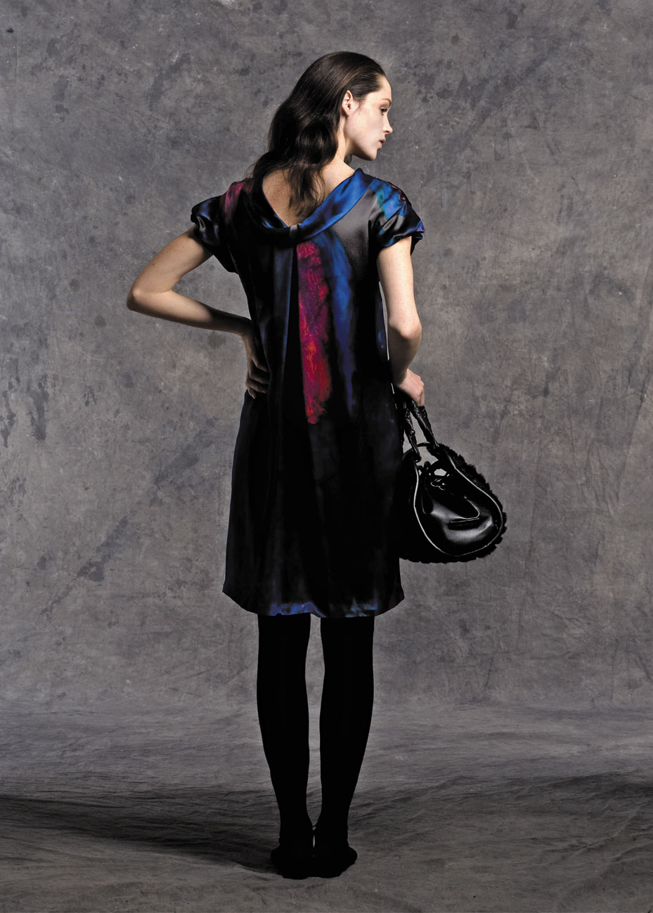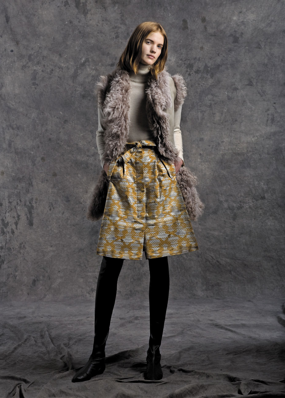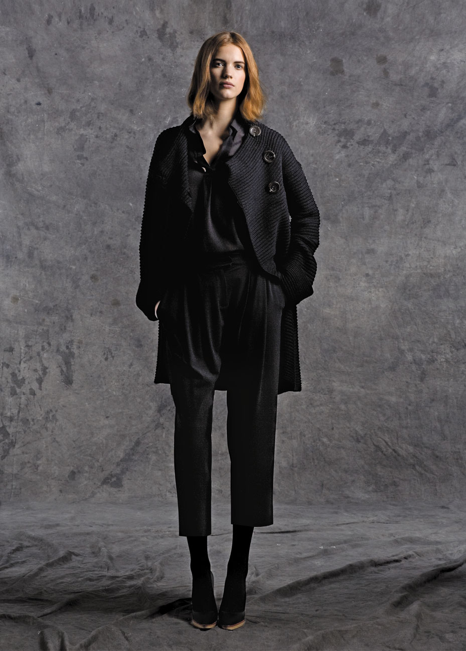 Le forme sono essenziali, a tratti asimmetriche, valorizzate da cuciture ornamentali e sottili pieghe a origami che conferiscono dinamismo alla figura. I tessuti, frutto di attenta ricerca e innovazione, sono morbidi e compatti: jacquard chinè sovrastampato, jacquard in seta e satin dai motivi floreali, raso di seta e jacquard di lana-seta e lurex abbinati a trame più giornaliere come la lana e il mohair. Infine il jersey, utilizzato nei modi più svariati per gli abiti e la maglieria.