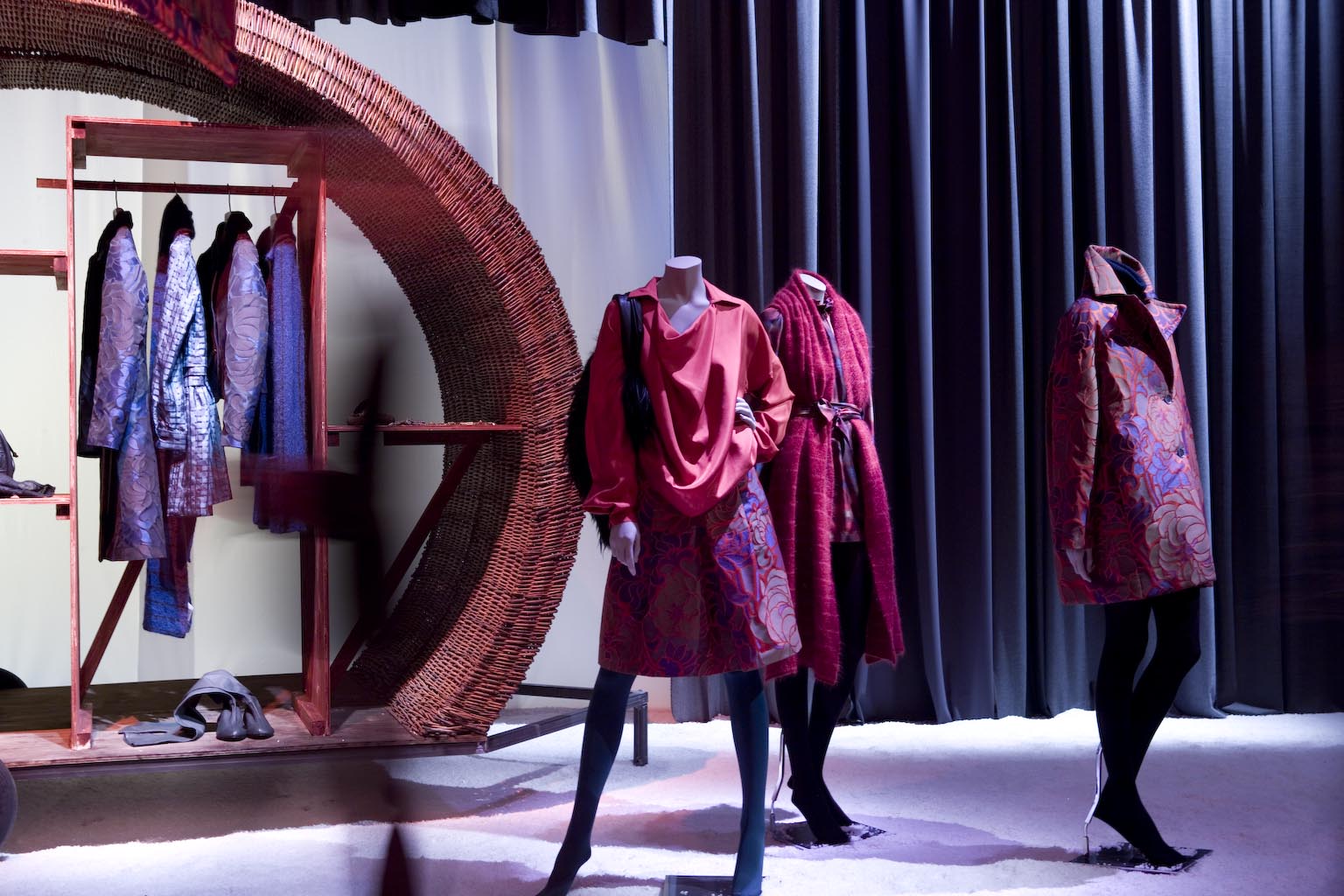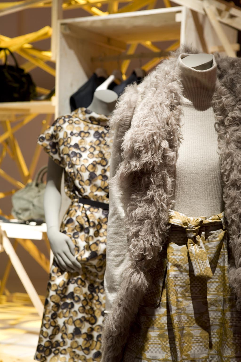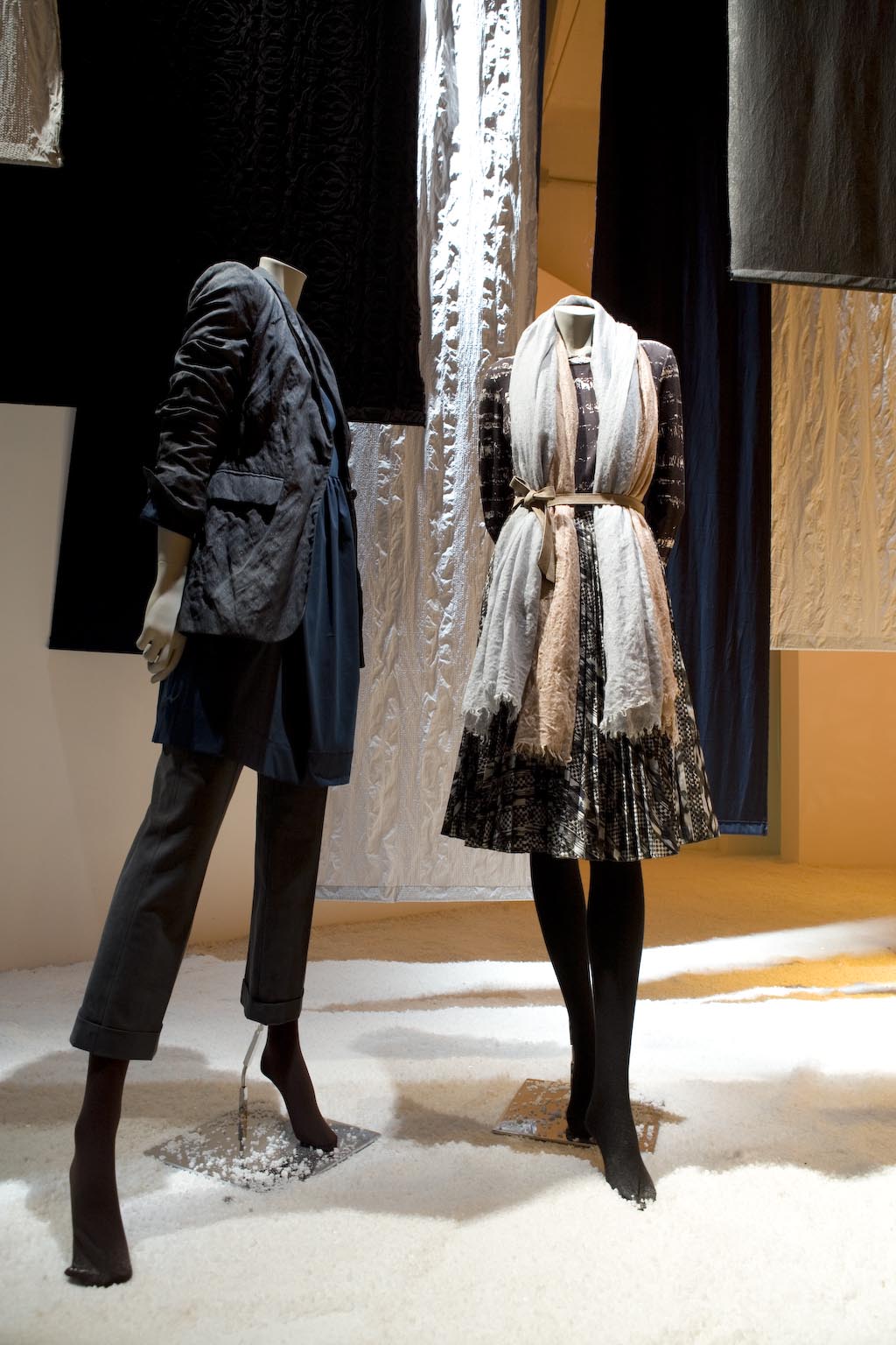 Le forme sono essenziali, a tratti asimmetriche, valorizzate da cuciture ornamentali e sottili pieghe a origami che conferiscono dinamismo alla figura. I tessuti, frutto di attenta ricerca e innovazione, sono morbidi e compatti: jacquard chinè sovrastampato, jacquard in seta e satin dai motivi floreali, raso di seta e jacquard di lana-seta e lurex abbinati a trame più giornaliere come la lana e il mohair. Infine il jersey, utilizzato nei modi più svariati per gli abiti e la maglieria.