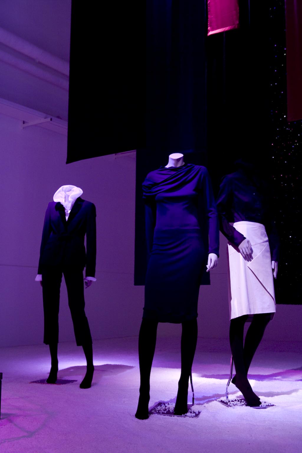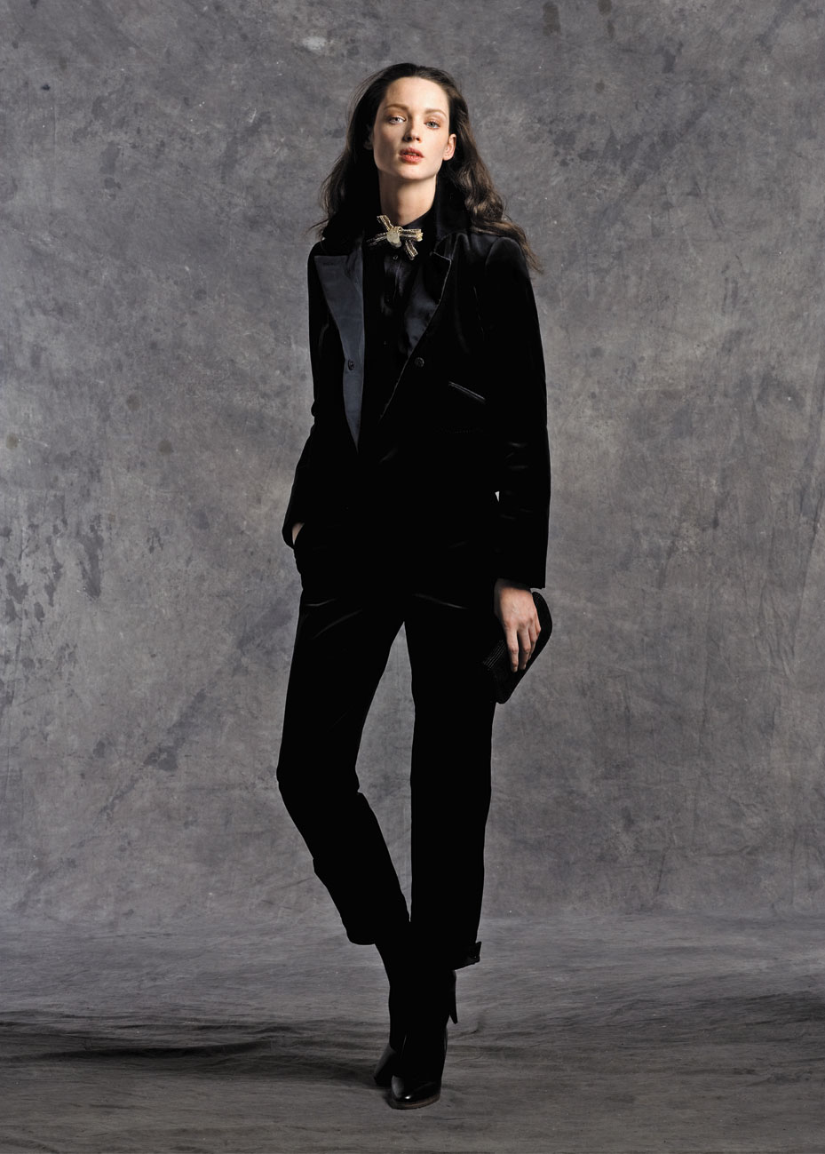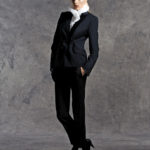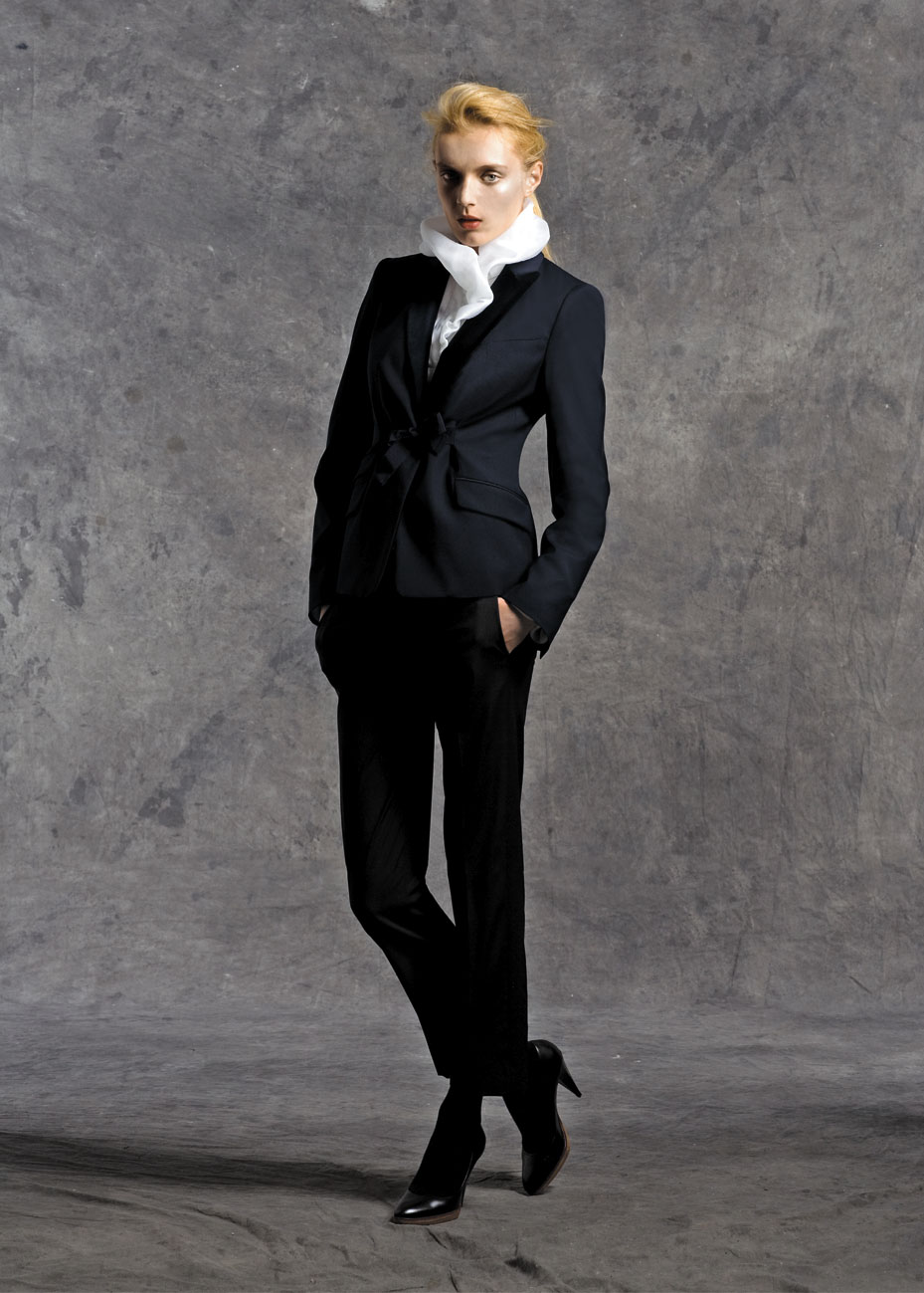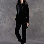 Assolutamente da non trascurare gli abiti chiave della collezione: giacca nera di mohair a quadri con collo a vulcano, abito in seta stampata “quattro in uno”, camicia con collo in organza rimovibile, smoking in velluto con giacca doppio petto e pantalone alla caviglia, piumino bomber in lana, cardigan oversize avvolgente. La novità principale è il pantalone, dalla forma a carota, quindi largo sul bacino e stretto alla caviglia.