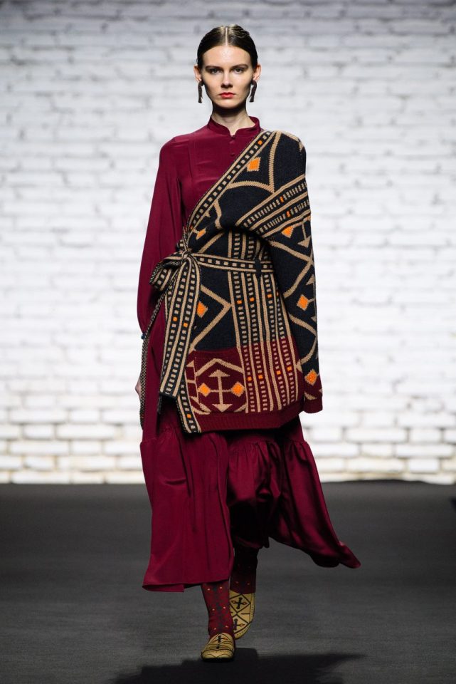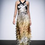 Strutturati ed eleganti i capi spalla sono stati cosparsi di applicazioni gioiello, rivisitazioni di quelle tradizionali indossate dai contadini iraniani. Le linee dei paltò si addolciscono per gli abiti; morbida la maglieria; fluttuanti e molto femminili le mise in seta leggera con fantasia paisley e maniche bombate. Giacche mono spalla dal sapore mediorientale e dai tratti grafici definiti si alternano a silhouette dal carattere più moderato.