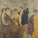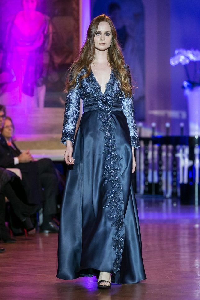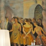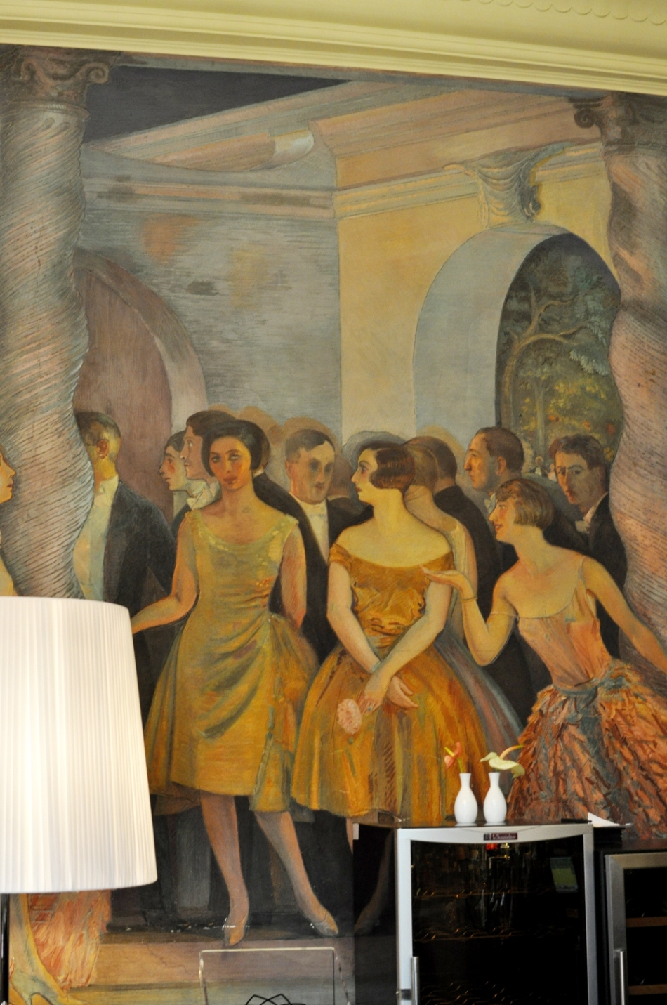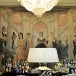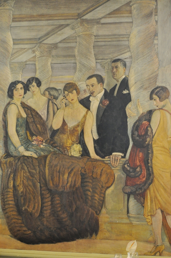 Il progetto “Creative District” si arricchisce di un’altra significativa particolarità che riguarda la scelta della location, ogni anno diversa: un luogo significativo, un edificio, una sala, un locale, ricco di storia e arte –Roma ne racchiude molti. Per questa edizione è stato scelto il Grand Hotel Palace di Via Veneto, già Hotel Ambasciatori, progettato da Marcello Piacentini negli anni ‘20 e riportato nel 2010 all’antico splendore grazie alla creatività di uno dei più conosciuti architetti italiani, Italo Rota. La sfilata si è svolta nel Salone Cadorin, dove è stato possibile ammirare gli affreschi realizzati nel 1926 dal pittore veneziano Guido Cadorin, un apparato decorativo unico nel suo genere -purtroppo dimenticato per molto tempo come il suo autore-, costituito dal ciclo di nove affascinanti trompe l’oeil nei quali viene celebrata l’alta società romana dell’epoca, potremmo dire la dolce vita romana dell’epoca. E’ rappresentata una festa e i vari invitati, in un angolo appare lo stesso pittore oltre agli architetti già famosi al tempo Marcello Piacentini, Giò Ponti e i committenti proprietari dell’Albergo e altri personaggi della società del tempo; naturalmente interessanti –è stato spontaneo il confronto con gli abiti della sfilata- sono apparse le mises sfoggiate dalle dame romane in questa festa notturna.