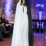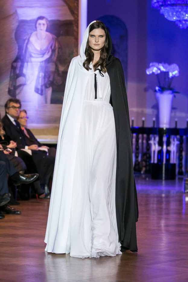 E questo non solo, come vedremo, nell’spirazione del brand, come si ammira nella collezione Haute Couture P/E 2018 di Asia Neri by Irene Mattei, che si propone come un omaggio alle bellezze architettoniche, paesaggistiche e artistiche della sua città natale “Siena”. L’arte sartoriale della giovane stilista si confronta nei volumi, nei drappeggi morbidi e nelle sinuosità dei tessuti con le opere dell’artista Ambrogio Lorenzetti, uno dei maestri della scuola senese del trecento. Il tributo a Siena si legge anche nella palette di colori degli outfits che prende ispirazione dallo stemma della città di Siena la “balzana”, uno scudo diviso in due porzioni orizzontali bianco e nero, così significativamente espresso nell’abito bianco lungo con cappa e cappuccio rigorosamente divisi a metà nei due colori: la severità monacale dell’abito sembra riportarci indietro nel tempo quando Santa Caterina percorreva le strade di Siena chiusa nel suo abito bianco e cappa nera.