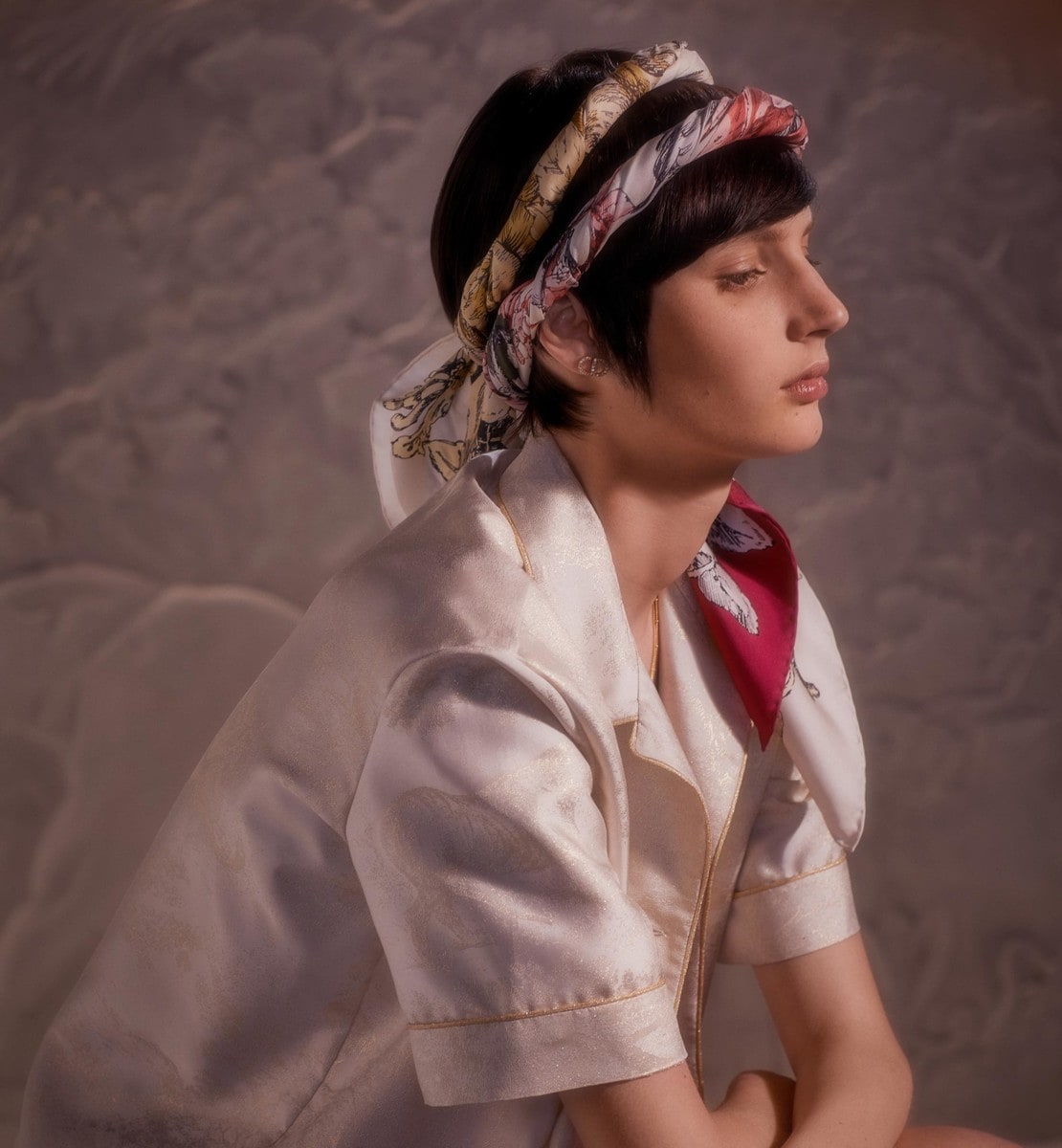 Il meglio di sé lo dimostra la sua duttilità nel trasformarsi. Stretto al collo, arrotolato sul manico di una it-bag, legato in vita al posto della cintura, annodato tra i capelli come un cerchietto, attorno all’amato e attuale messy bun o all over the head come turbante.