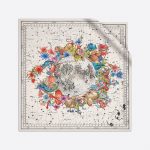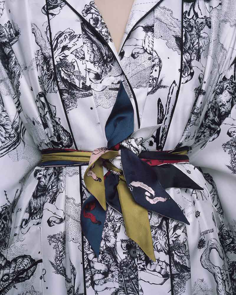 E poi i dettagli. Splendidi i motivi legati all’astrologia e ai tarocchi che regalano alla seta uno spirito magico e fiabesco. Una vera espressione artistica oltre che artigianale di un prodotto realizzato nei laboratori italiani della casa. I bordi sono tutti arrotolati a mano e la colorazione è un inno alla più sapiente e devota tradizione dell’incisione a penna. L’insieme compositivo che si fa strada tra costellazioni, fiori, arabeschi e protomi leonine, è il risultato di una minuziosa analisi di tratti e tonalità del disegno che risulta sofisticato e coinvolgente.