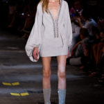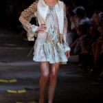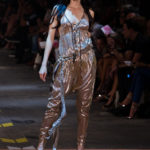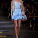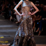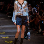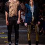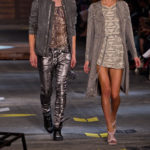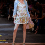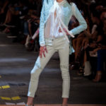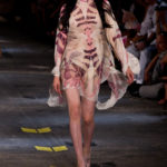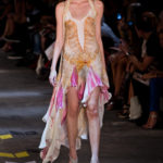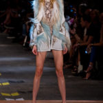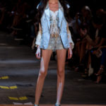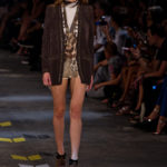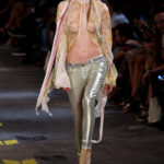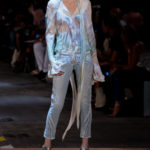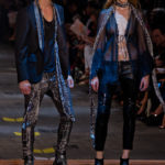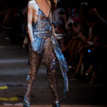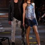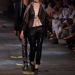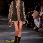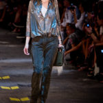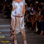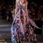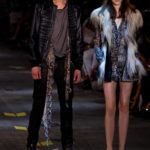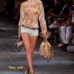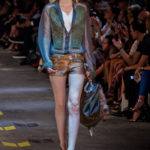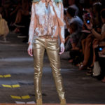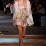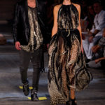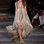 E finalmente l’atmosfera si fa calda e compare il primo abito: tonalità giallo pastello, giocate su trasparenze e jeans attillati con ricami a contrasto e sciarpa delicatamente annodata con stampa animalier. Stivaletto alto aperto sul davanti. Una nuova, allo stesso tempo, antica immagine firmata Cavalli; era da varie collezioni che non si vedeva una donna così forte e grintosa solcare la passerella. Una donna sicura, piena di forza che si mostra, vestita con abiti leggeri, giovani, freschi, ma allo stesso tempo ricchi di macrostampe di tessiture tratte dal mondo animale e dalla foresta. Una giungla di linee e volumi leggeri che si scontrano con pantaloni e jeans strutturati e fascianti che sottolineano le linee del corpo. Scocche di giubbotti di pelle, con zip e catene, cuciti a filo grosso per evidenziare i tagli netti e le geometrie pulite e arrichite da dettagli importanti di ricami, cuciture e applicazioni in metallo.