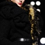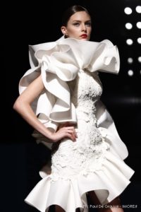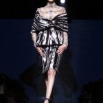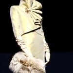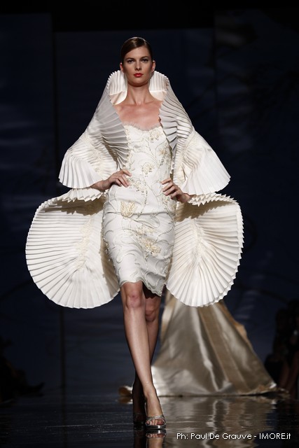 La sua sperimentata arte sartoriale interpretare mirabilmente questo suggerimento per creare pezzi come la bella cappa bianca corta costruita da tanti ventagli plissettati sovrapposti, portata su un abito bianco ricamato. Il filo conduttore di parte della collezione sembrano essere le volute, ruches bianche che attraversano la lunga gonna dell’abito bianco col corpino ricamato in blu; o ampie ruches che definiscono marcatamente l’abito corto ancora bianco. Poi sono le plissettature sovrapposte in gradazione che imitano le volute della sezione della conchiglia di un mollusco primitivo il Nautilus sul davanti dell’abito giallo. Sarà sempre la plissettatura a ventaglio a dare la silhouette ad S all’ abito nero corto e a costruire la giacca rossa porta su gonna nera.