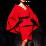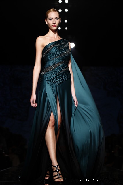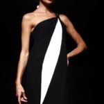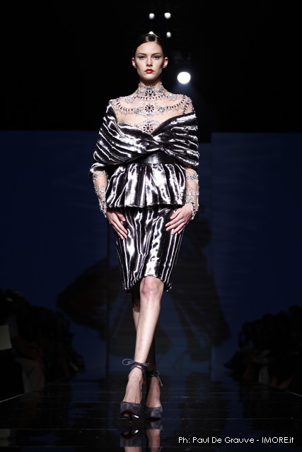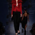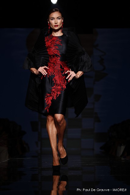 Ma Sarli modifica ancora e diversamente la silhouette. Sceglie di costrire maniche gonfie, maniche farfalla per ottenere una linea quadrata, di aggiungere grandi fiocchi come nell’abito blu melanzana lungo, lavorazioni origami per costruire il rever di una giacca o per dare una nuova tridimensionalità agli abiti, colli sovrapposti come nelle giacche rosse per una liena a calice, volumi accentuati per dare vita ad esempio ad una cappa corta ancora rossa . La silhouette diventa scivolata, accostata al corpo nel bell’abito lungo dal taglio del corpino diagonale, drappeggiato, il tessuto ripreso alla base del corpino stesso dà ampiezza alla gonna per il movimento. La linea scivilata, si gonfia nel movimento per mostrare le sfumatura del colore, nell’abito blu notte che diventa color petroleo. Segnano la linea del corpo i tailleur neri dal corpino bustier nero lucido che poggia sui fianchi completati da soprabito nero. Linea scivolata anche per l’abito “Onna” che andrà all’asta per aiutare le popolazioni abbruzzesi. Si tratta di una tunica in crespo nero, con intarsi bianchi quale simbolo di speranza per la terra d’Abbruzzo.
