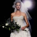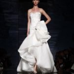Come sempre Sarli termina la sfilata con l’abito da sposa dal corpino tutto ricamato di perle che disegnano una conchiglia e la gonna costruita in strati di ruche di organza.