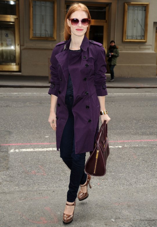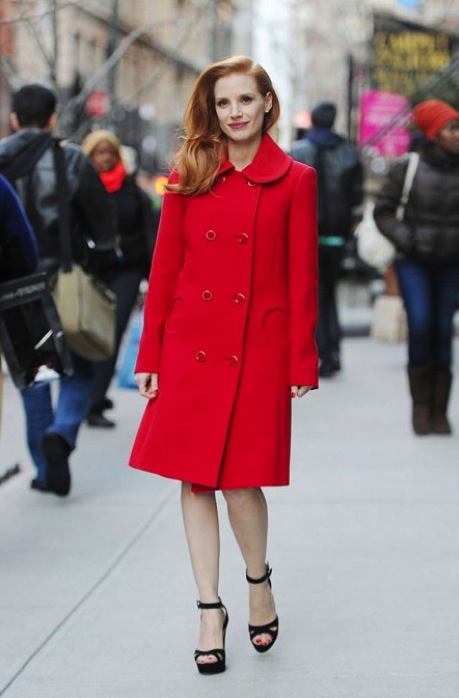 Gli abiti che sceglie tendono sempre a seguire le forme del corpo, a volte resi particolari da tagli inusuali, ma l’elemento che colpisce di più è il colore: sfatando il mito secondo cui le rosse devono stare attente ai colori che portano, la Chastain non si tira indietro dallo sfoggiarne un’impressionante varietà, da quelli che più si adattano ad una chioma come la sua, ad esempio viola (come l’abito tempestato di pietre preziose e con moderato spacco centrale firmato Givenchy indossato al Festival di Cannes di quest’anno) e verde, fino a quelli da cui dovrebbe stare alla larga per evitare tremendi effetti du contrasto, come giallo, rosa e rosso (ad esempio il vestito con scollatura a cuore di Alexander McQueen sfoggiato ai SAG Awards 2013). Per quanto il giallo non le doni affatto, il rosso non la fa per niente sfigurare, anche se per fortuna il suo colore preferito sembra essere il blu, sia per gli eleganti vestiti da sera che per gli abiti da giorno che preferisce per eventi come trasmissioni televisive o conferenze stampa. Lunghi al ginocchio e sempre tendenti a seguire la forma del corpo, con a volte qualche aggiunta particolare come drappeggi o maniche ad effetto a cappa, sono abiti che una donna qualunque indosserebbe senza problemi durante le sue lunghe giornate. Anche in queste occasioni meno importanti la Chastain non rinuncia al colore, anche se tende a favorire tinte meno accese di quelle dei suoi abiti da sera, ad esempio lilla o blu di Prussia.