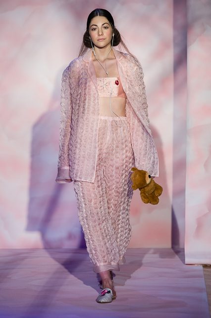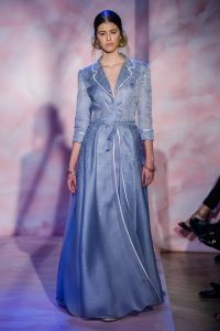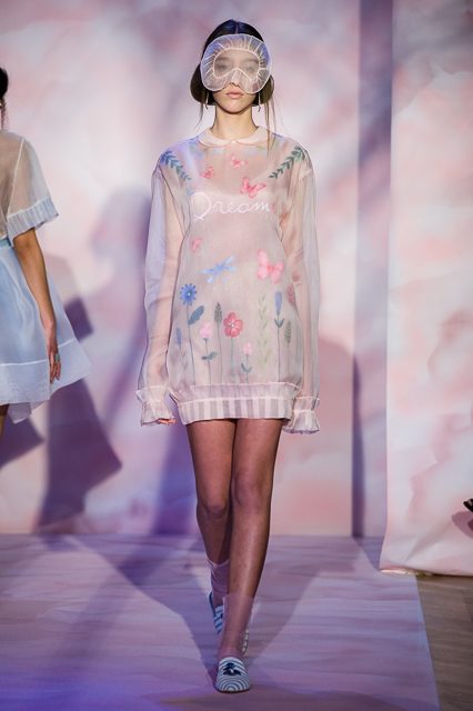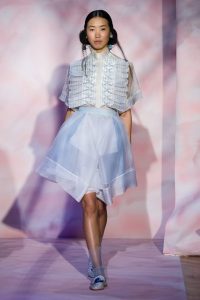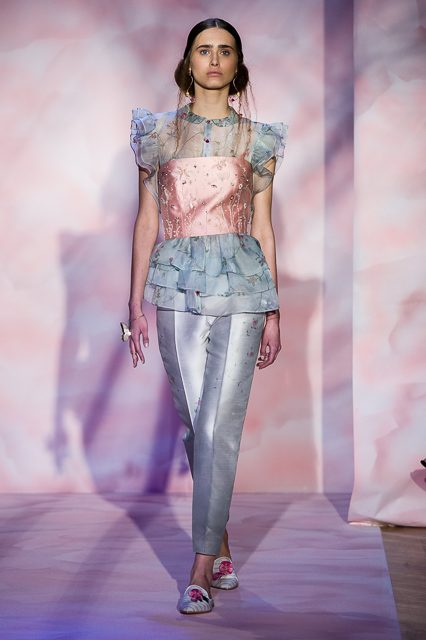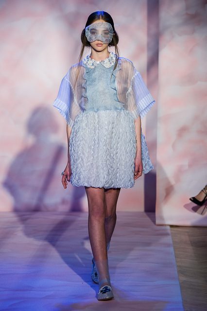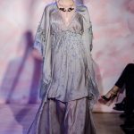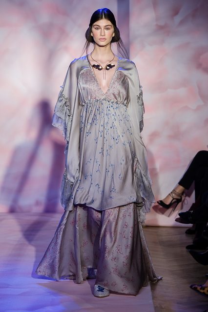 Mariotto sorprendentemente veste delle adolescenti, ma le scegli a modo suo, esasperatamente romantiche e sognanti, vivono sotto una nuvola e indossano nuvole di colori tenui che il loro couturier trasporta in terra sotto forma di piccoli capolavori. Soffici volumi ottenuti con lavorazioni di alta sartoria, attraverso una sofisticata ricerca dell’antica tecnica dei punti smock. Camicie over in organza, dallo sparato rubato al guardaroba maschile con effetto matelassè, gonne dalle pieghe severe, unite tra loro da piccoli fiocchi di tessuto con effetto origami. Il classico pigiama a righe è trasformatoin un capolavoro d’alta moda: in organza di seta con quattromilaottocento punti smock dall’effetto matelassè. Bellissimo l’abiti vestaglia in azzurro polvere tempestato di luce cristalli e madreperle sui revers e il corpino e il caftano di charmeuse dipinto a mano.