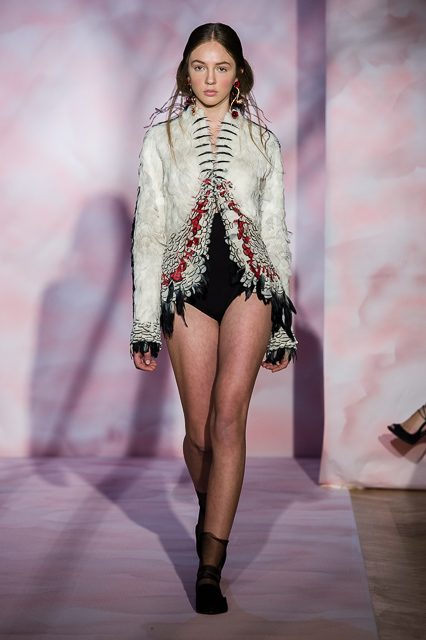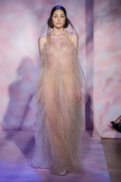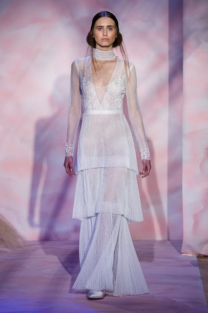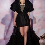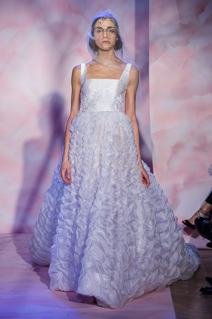 Il sogno dell’adolescente diventa all’improvviso l’immagine di una donna adulta e trasgressiva: accanto agli abiti dai colori tenui -rosa nelle sue diverse nuances, azzurro polvere, verde salvia, grigio perla, lampone, bianco- ecco che irrompe il nero in un piccolo chiodo in piume di gallo, struzzo e pernice, indossato su culotte, e nei preziosi abiti arricchiti da preziosi ricami in rafia e micro black boule, adatti ad una donna pericolosa, aggressiva e sensuale. Il sogno adulto svanisce e ritornano gli abiti evanescenti per la giovanissima creatura, non ancora avvezza alla cruda realtà, ma che sogna il suo personale abito da sposa da scegliere tra quello a balze plissè realizzate con pregiatissime retine giapponesi e ricami di fiori, o nella lavorazioni del punto smock gigante sull’ampia gonna, che parte dal corpino di mikado ricamato. Una sposa inquietante quest’ ultima dal volto scomposto dalla veletta ricamate.