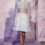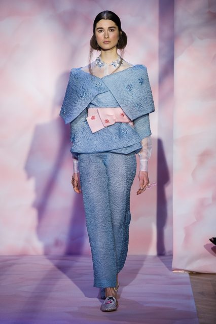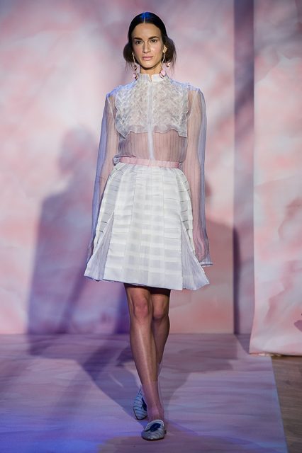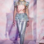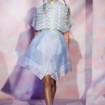 “La mia donna ritorna misteriosamente alla sua adolescenza – dichiara Mariotto – Vive una nuova esistenza e una nuova giovinezza. Più spensierata, più libera come la new couture che scende dai tacchi ma non rinuncia ai rituali tipici dell’alta moda. Iperbole sartoriale”. I rituali dell’alta moda è certamente questa l’iperbole sartoriale che porta lo stilista a cimentarsi a costruire volumi con eterei tessuti, che diventano una sontuosa stola, una gonfia giacca da portare su leggerissimi e trasparenti pantaloni, un gioco di origami nel completo con la gonna dall’orlo asimmetrico; il tutto realizzato attraverso una accurata selezione di tipi di punto smock lavorato in forma gigante o micro.