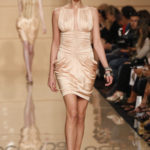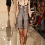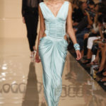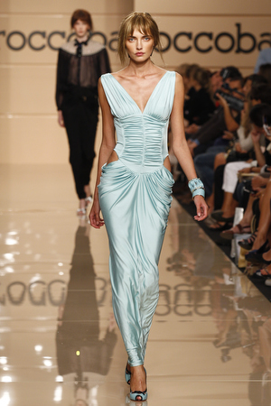 La silhouette è avvolta morbidamente dai tubini in jersey con il punto vita drappeggiato, oppure da abiti lunghi che scivolano sul corpo, sui quali si aprono piccoli oblò ad evidenziare ancora una volta i fianchi. Sandali altissimi o piatti, borse effetto paglia intrecciata e foulard completano la collezione.