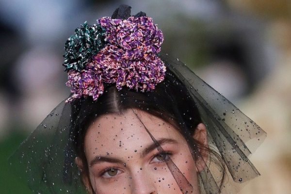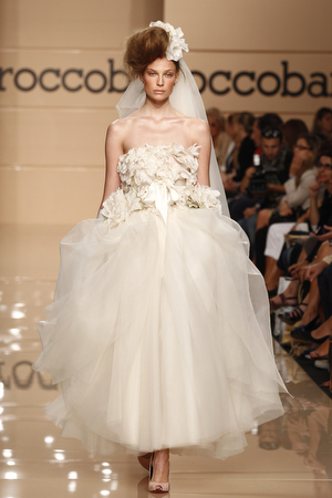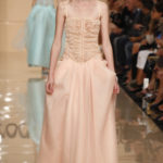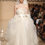 L’ispirazione all’immagine della donna africana si coglie anche nell’acconciatura delle modelle: la fronte è coperta da una frangia dritta e i capelli sono raccolti in una coda bassa da un fermaglio che riprende i colori e le geometrie tribali degli abiti. Pettinatura decisamente più selvaggia e voluminosa per la sposa che chiude la sfilata in un abito vaporoso, con tanto di rosa applicata su un fianco, la stessa che decora la testa. La proposta per il giorno del sì è meno tribale, forse, ma troppo vistosa.