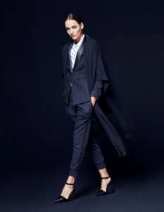 Una donna che “ruba” dal guardaroba maschile fogge da reinterpretare morbidamente e tessuti da ingentilire come solo il suo tocco garbato sa fare (un pizzo, un tulle, una spilla, un plissé, una nota profumata…..).