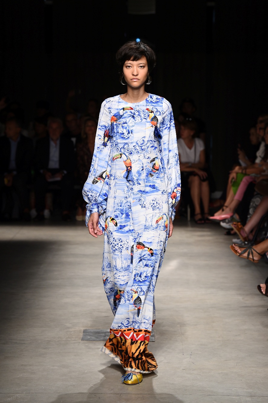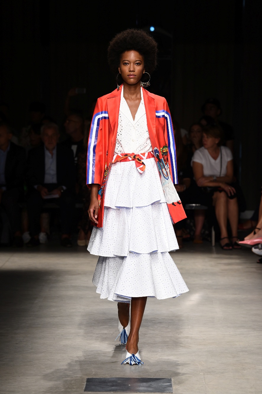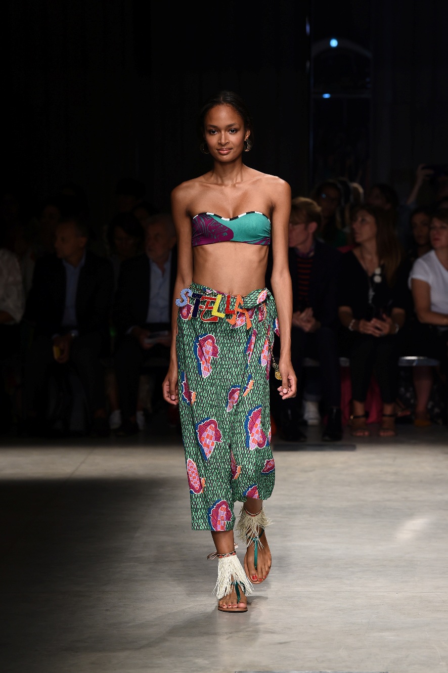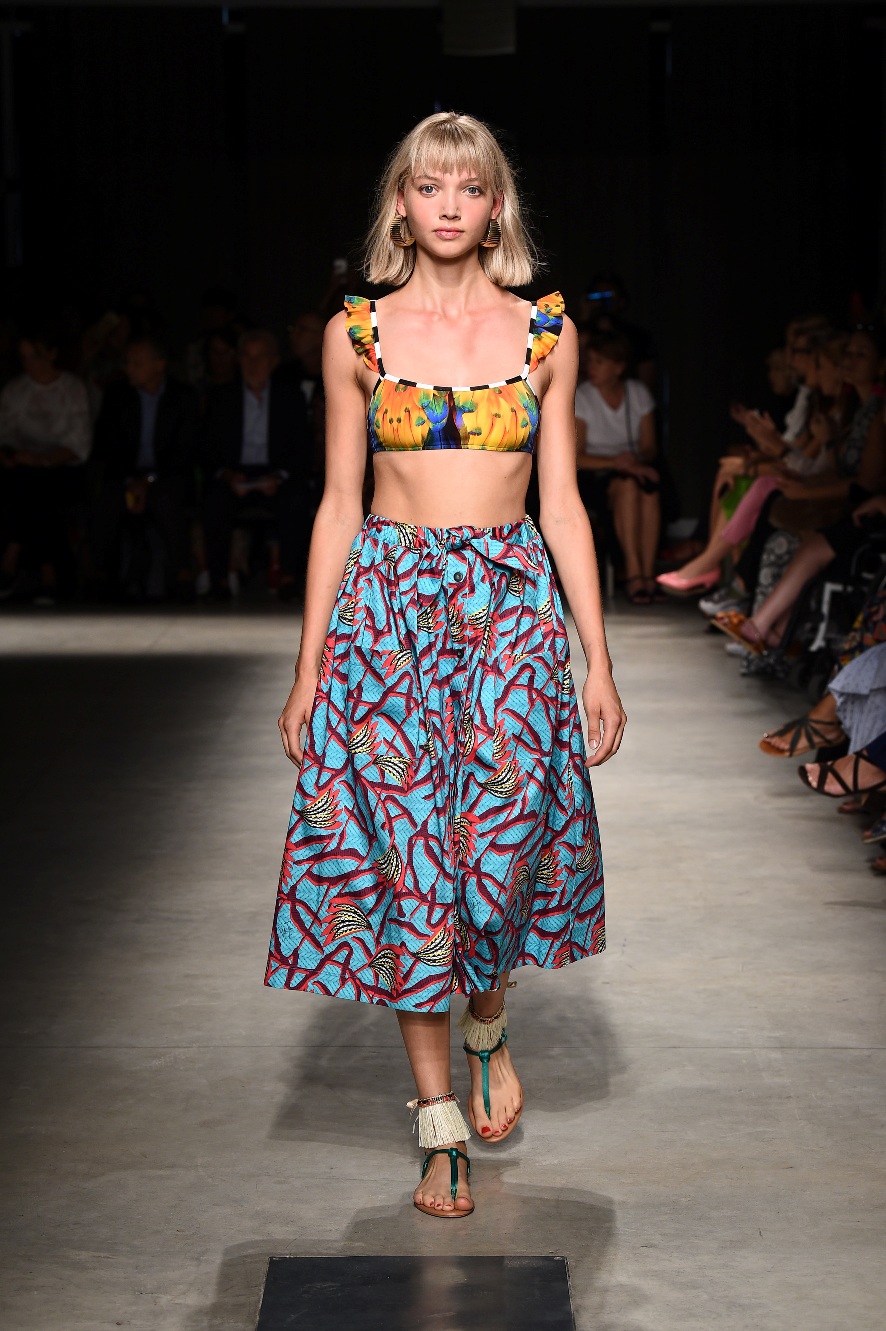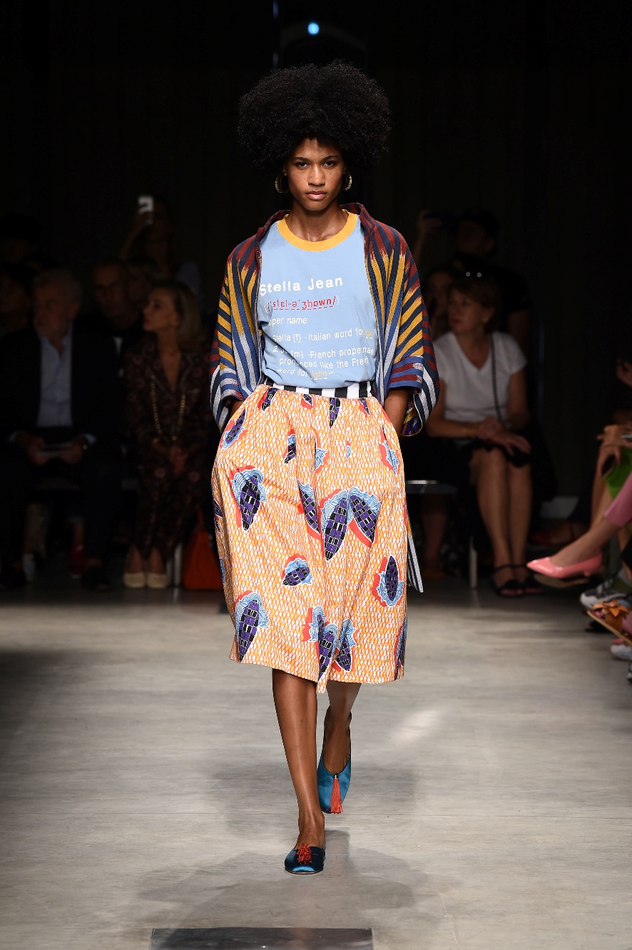 Attraverso il suo viaggio dal Benin al Brasile Stella Jean ha costruito una collezione lineare, coerente, fresca, giovanile, colorata, e come sempre multietnica dove si mescolano, in uno stesso capo, suggestioni e memorie di Paesi diversi, o si evidenziano i legami ancora vivi dopo secoli con la lontana terra di origine degli africani del Brasile. Troviamo così le gonne a balze tipiche di Bahia, completate dalle camicie di cotone -sempre presenti nelle sue collezioni- di taglio maschile, dalle maniche esagerate. I motivi degli azulejos portoghesi (piastrelle di ceramica con superficie smaltata, nella forma più antica, in blu), arricchiti da colorati pappagalli, sono stampati in colore azzurro su gonna di linea sirena completata da un top a quadri bianco e blu, un abitino corto, un completo –gonna plissettata e camicia morbida con piccolo collo a scialle e fiocco-; talvolta gli abiti hanno bordo a contrasto animalier. Il cotone bianco del Benin è impreziosito da due pappagalli coloratissimi ricamati/dipinti sulle voluminose maniche a sbuffo di una camicetta indossata con una gomma maxi. Ritroviamo il bianco nel lungo abito con un esagerato pappagallo ricamato su un fianco per tutta la lunghezza dell’abito. Accanto agli abiti decorati con scene di donne vestite con abiti di Bahia dipinti a mano e ricamati – come nell’abito bustier rosso e sulla voluminosa gonna rossa portata con un sopra singolare, composto da un largo nastro a motivi geometrici che si intreccia sul davanti e lascia le spalle scoperte, mentre un residuo di manica utilizza cotone a righe-, trovano posto le stampe optical; ed anche il pizzo sangallo nell’abito a balze con giacca rossa e in quello dalle spalle scoperte decorato da nastri con motivi geometrici. Interessante l’interpretazione del classico tranch in una versione moderna e allegra in tessuto a righe di colori diversi.