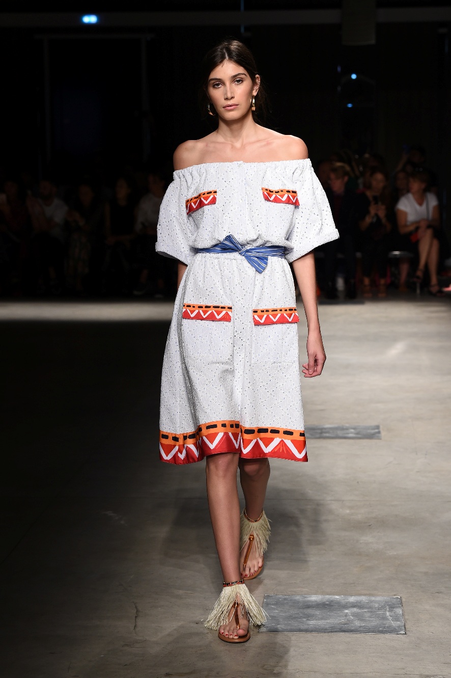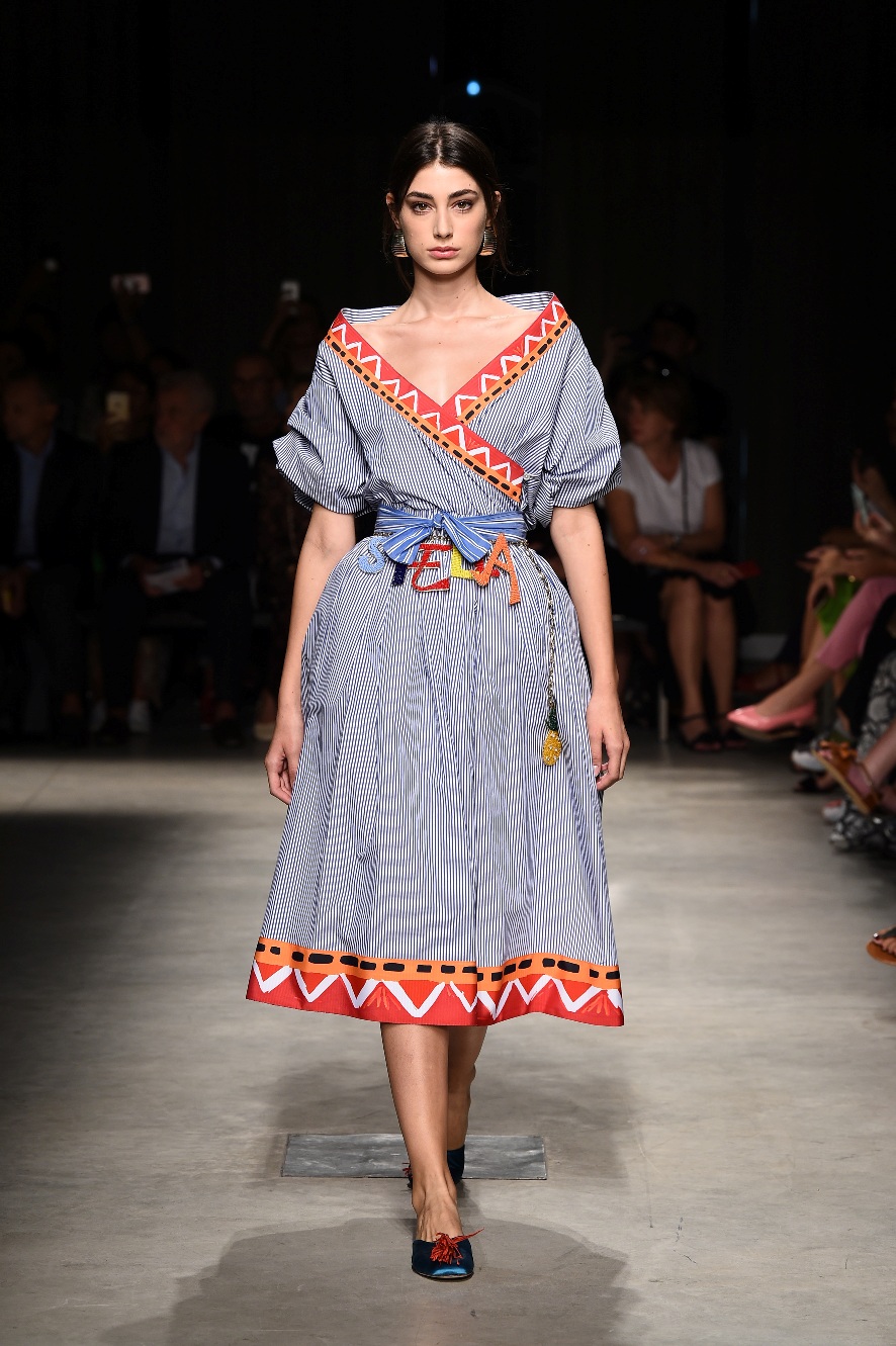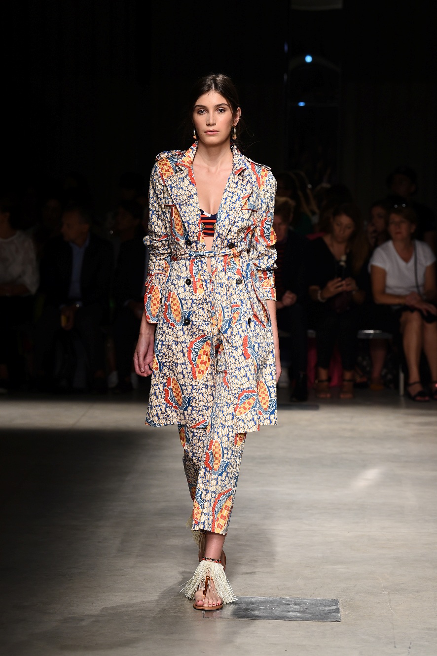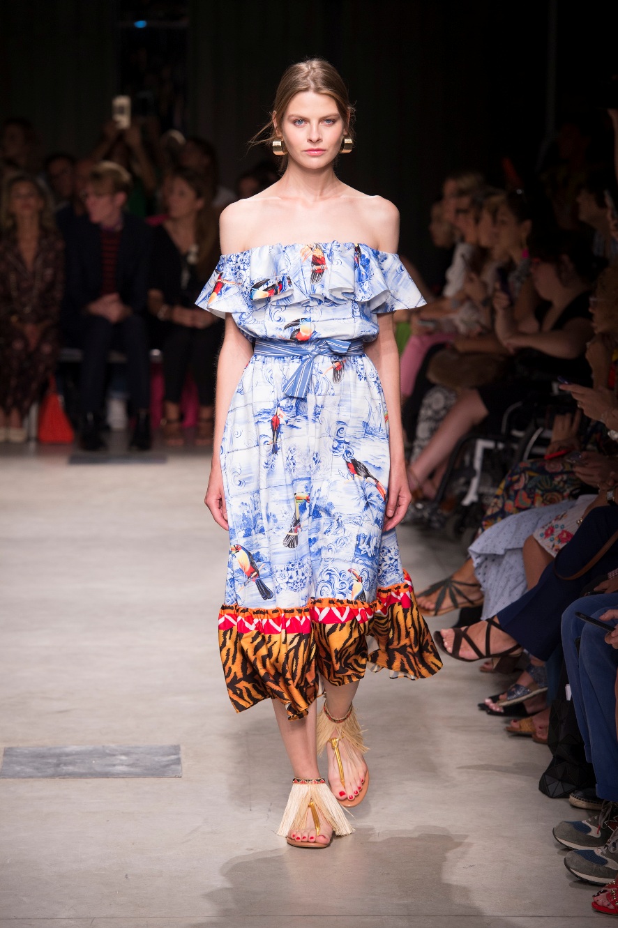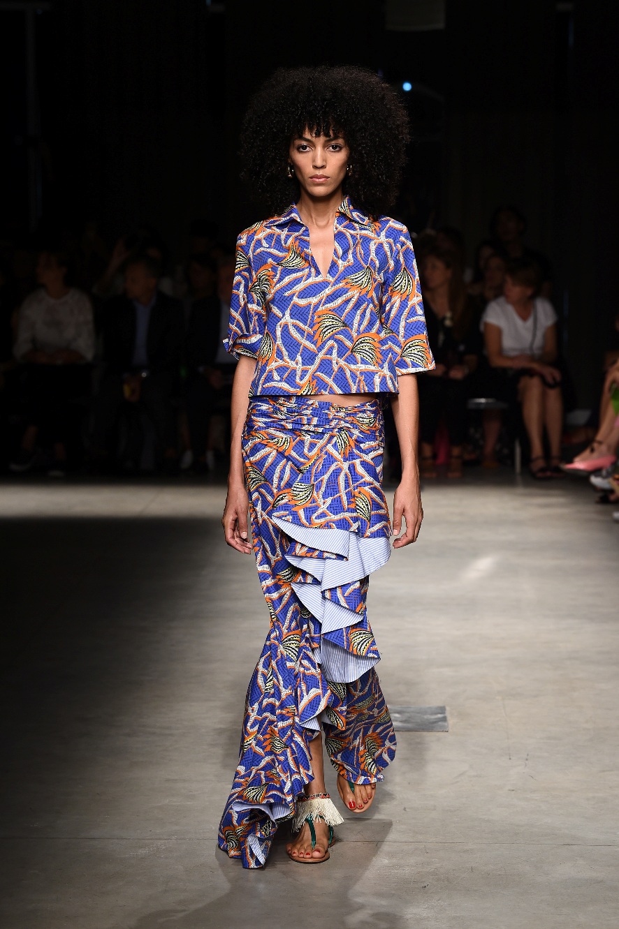 Attraverso il suo viaggio dal Benin al Brasile Stella Jean ha costruito una collezione lineare, coerente, fresca, giovanile, colorata, e come sempre multietnica dove si mescolano, in uno stesso capo, suggestioni e memorie di Paesi diversi, o si evidenziano i legami ancora vivi dopo secoli con la lontana terra di origine degli africani del Brasile. Troviamo così le gonne a balze tipiche di Bahia, completate dalle camicie di cotone -sempre presenti nelle sue collezioni- di taglio maschile, dalle maniche esagerate. I motivi degli azulejos portoghesi (piastrelle di ceramica con superficie smaltata, nella forma più antica, in blu), arricchiti da colorati pappagalli, sono stampati in colore azzurro su gonna di linea sirena completata da un top a quadri bianco e blu, un abitino corto, un completo –gonna plissettata e camicia morbida con piccolo collo a scialle e fiocco-; talvolta gli abiti hanno bordo a contrasto animalier. Il cotone bianco del Benin è impreziosito da due pappagalli coloratissimi ricamati/dipinti sulle voluminose maniche a sbuffo di una camicetta indossata con una gomma maxi. Ritroviamo il bianco nel lungo abito con un esagerato pappagallo ricamato su un fianco per tutta la lunghezza dell’abito. Accanto agli abiti decorati con scene di donne vestite con abiti di Bahia dipinti a mano e ricamati – come nell’abito bustier rosso e sulla voluminosa gonna rossa portata con un sopra singolare, composto da un largo nastro a motivi geometrici che si intreccia sul davanti e lascia le spalle scoperte, mentre un residuo di manica utilizza cotone a righe-, trovano posto le stampe optical; ed anche il pizzo sangallo nell’abito a balze con giacca rossa e in quello dalle spalle scoperte decorato da nastri con motivi geometrici. Interessante l’interpretazione del classico tranch in una versione moderna e allegra in tessuto a righe di colori diversi.