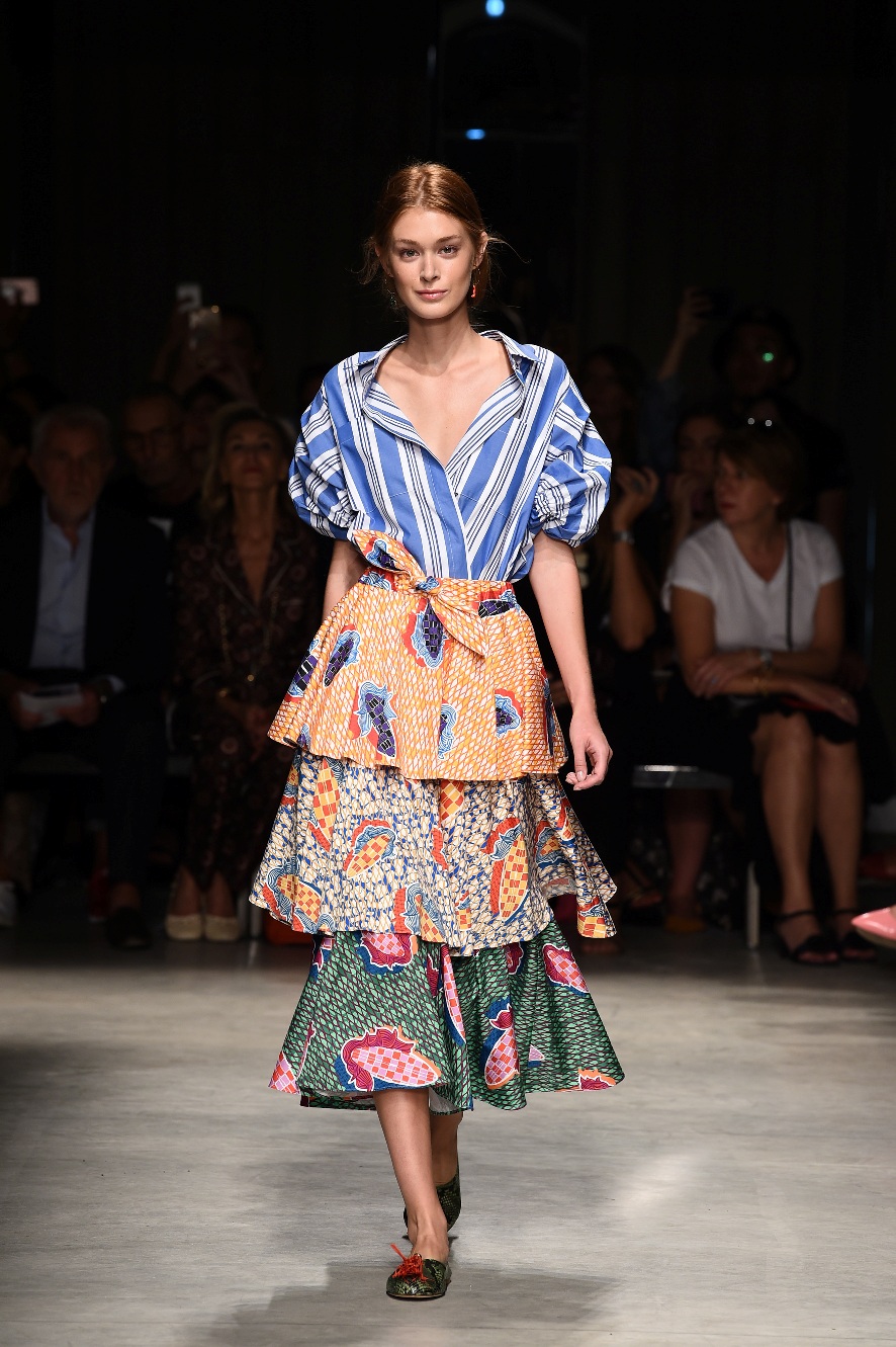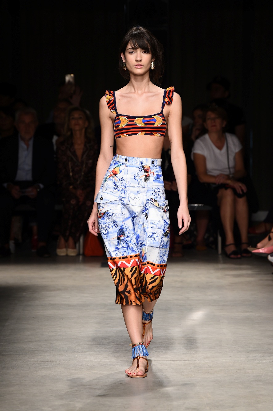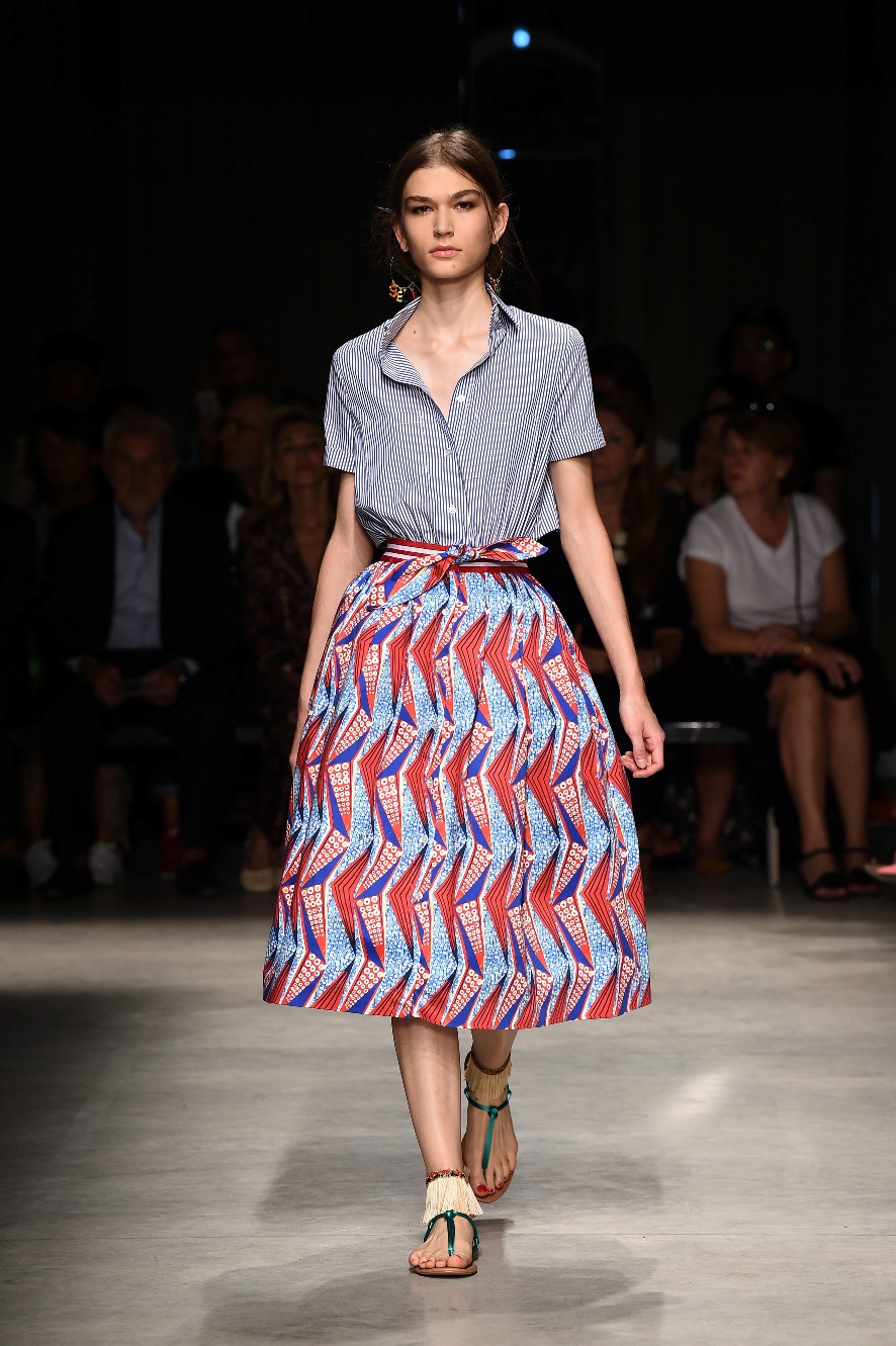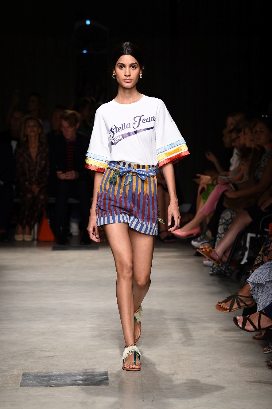 Attraverso il suo viaggio dal Benin al Brasile Stella Jean ha costruito una collezione lineare, coerente, fresca, giovanile, colorata, e come sempre multietnica dove si mescolano, in uno stesso capo, suggestioni e memorie di Paesi diversi, o si evidenziano i legami ancora vivi dopo secoli con la lontana terra di origine degli africani del Brasile. Troviamo così le gonne a balze tipiche di Bahia, completate dalle camicie di cotone -sempre presenti nelle sue collezioni- di taglio maschile, dalle maniche esagerate. I motivi degli azulejos portoghesi (piastrelle di ceramica con superficie smaltata, nella forma più antica, in blu), arricchiti da colorati pappagalli, sono stampati in colore azzurro su gonna di linea sirena completata da un top a quadri bianco e blu, un abitino corto, un completo –gonna plissettata e camicia morbida con piccolo collo a scialle e fiocco-; talvolta gli abiti hanno bordo a contrasto animalier. Il cotone bianco del Benin è impreziosito da due pappagalli coloratissimi ricamati/dipinti sulle voluminose maniche a sbuffo di una camicetta indossata con una gomma maxi. Ritroviamo il bianco nel lungo abito con un esagerato pappagallo ricamato su un fianco per tutta la lunghezza dell’abito. Accanto agli abiti decorati con scene di donne vestite con abiti di Bahia dipinti a mano e ricamati – come nell’abito bustier rosso e sulla voluminosa gonna rossa portata con un sopra singolare, composto da un largo nastro a motivi geometrici che si intreccia sul davanti e lascia le spalle scoperte, mentre un residuo di manica utilizza cotone a righe-, trovano posto le stampe optical; ed anche il pizzo sangallo nell’abito a balze con giacca rossa e in quello dalle spalle scoperte decorato da nastri con motivi geometrici. Interessante l’interpretazione del classico tranch in una versione moderna e allegra in tessuto a righe di colori diversi.