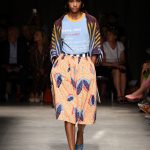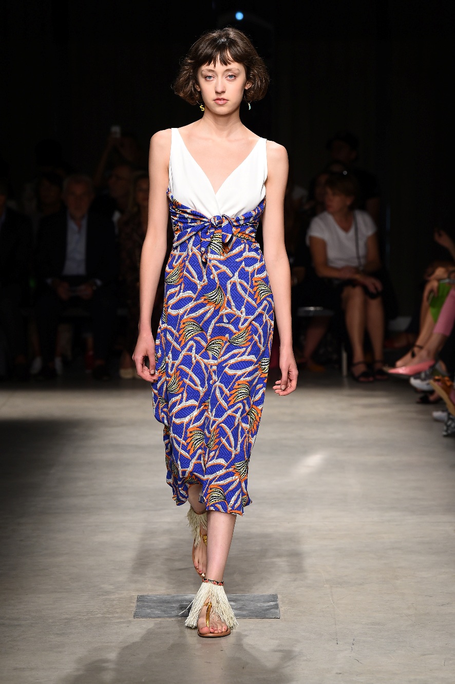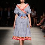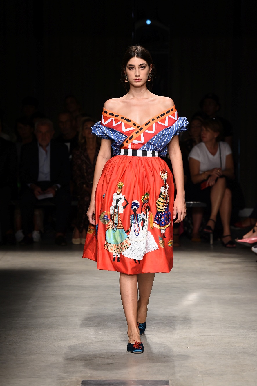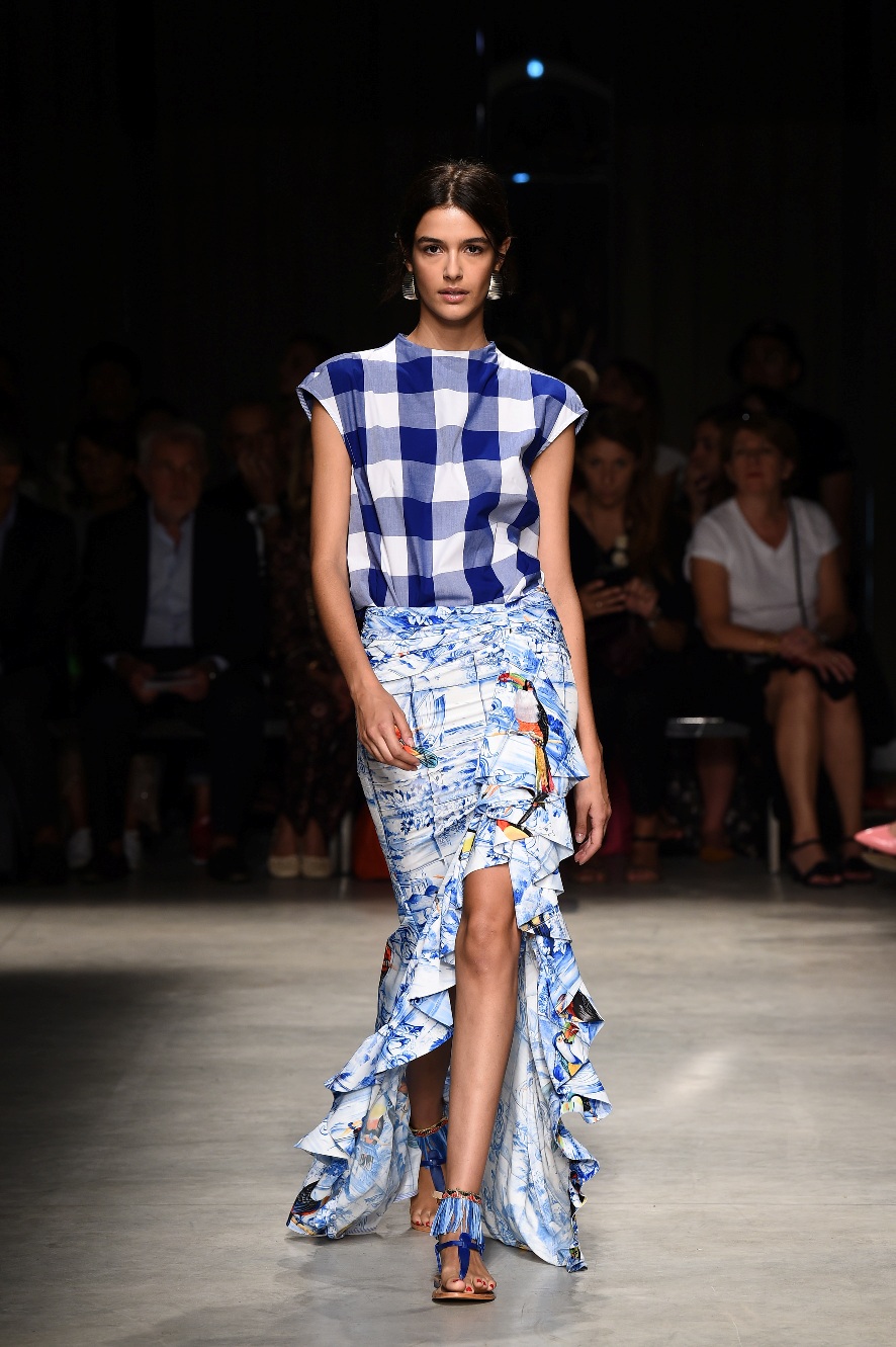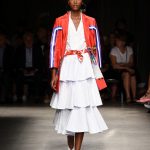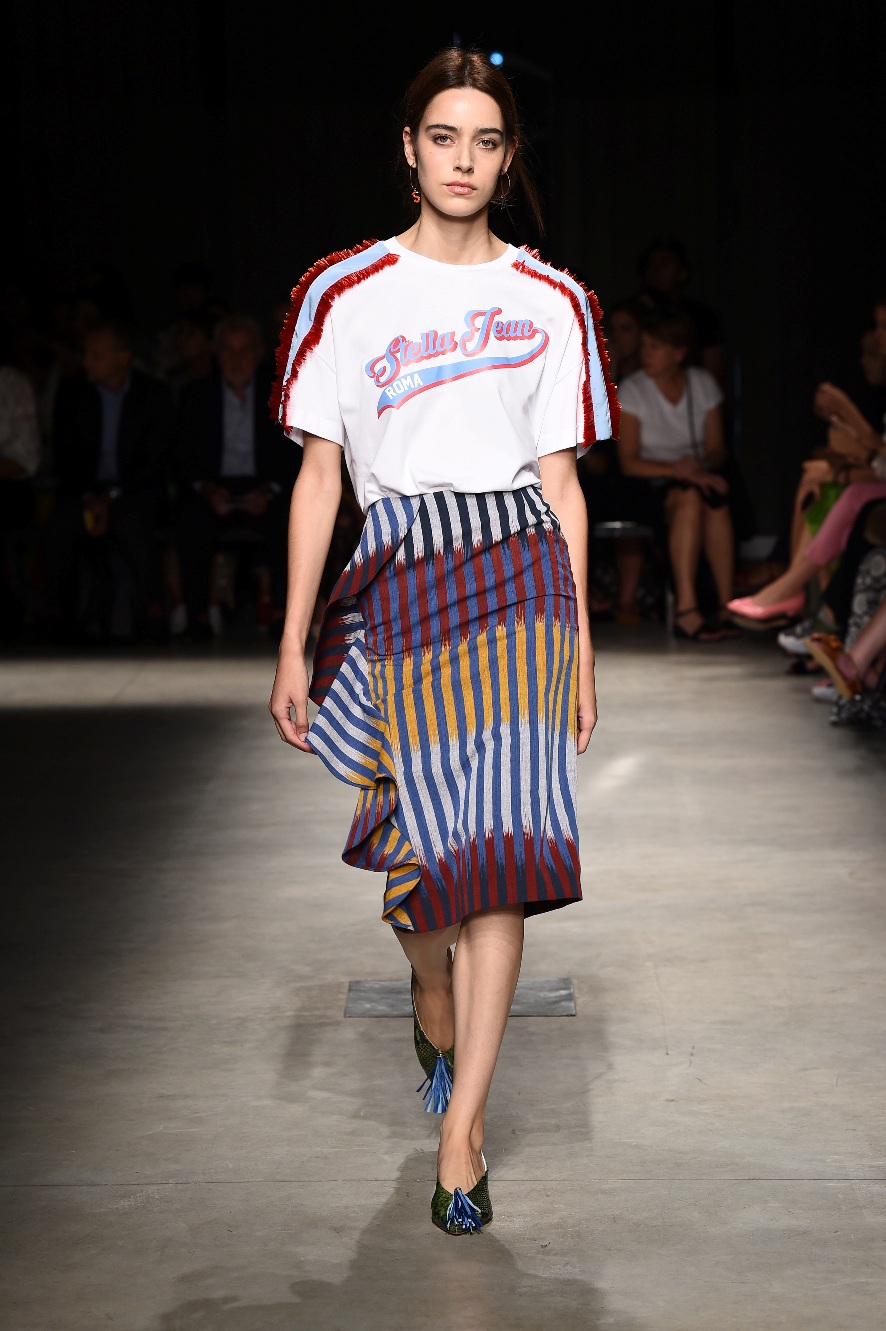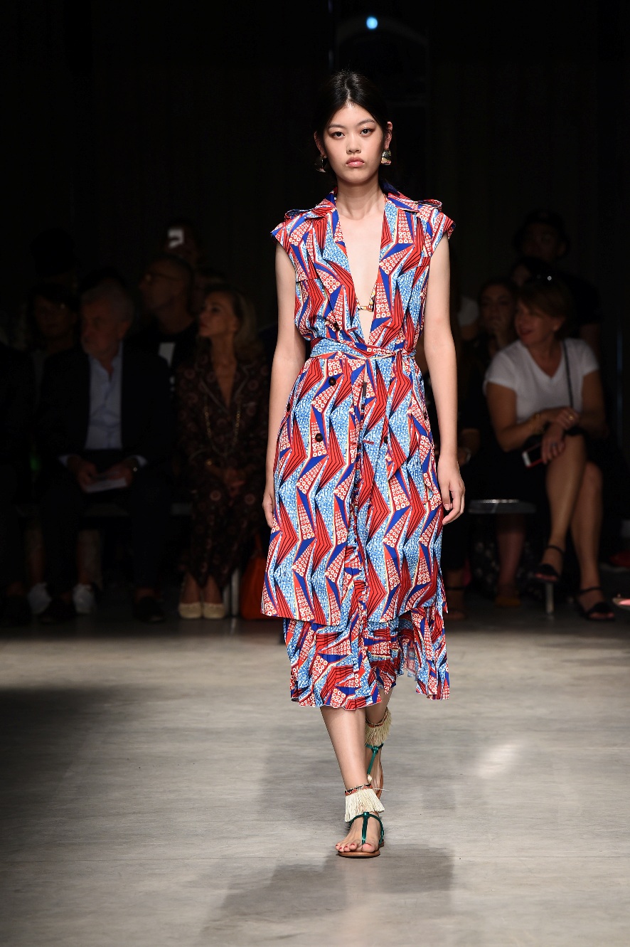 Attraverso il suo viaggio dal Benin al Brasile Stella Jean ha costruito una collezione lineare, coerente, fresca, giovanile, colorata, e come sempre multietnica dove si mescolano, in uno stesso capo, suggestioni e memorie di Paesi diversi, o si evidenziano i legami ancora vivi dopo secoli con la lontana terra di origine degli africani del Brasile. Troviamo così le gonne a balze tipiche di Bahia, completate dalle camicie di cotone -sempre presenti nelle sue collezioni- di taglio maschile, dalle maniche esagerate. I motivi degli azulejos portoghesi (piastrelle di ceramica con superficie smaltata, nella forma più antica, in blu), arricchiti da colorati pappagalli, sono stampati in colore azzurro su gonna di linea sirena completata da un top a quadri bianco e blu, un abitino corto, un completo –gonna plissettata e camicia morbida con piccolo collo a scialle e fiocco-; talvolta gli abiti hanno bordo a contrasto animalier. Il cotone bianco del Benin è impreziosito da due pappagalli coloratissimi ricamati/dipinti sulle voluminose maniche a sbuffo di una camicetta indossata con una gomma maxi. Ritroviamo il bianco nel lungo abito con un esagerato pappagallo ricamato su un fianco per tutta la lunghezza dell’abito. Accanto agli abiti decorati con scene di donne vestite con abiti di Bahia dipinti a mano e ricamati – come nell’abito bustier rosso e sulla voluminosa gonna rossa portata con un sopra singolare, composto da un largo nastro a motivi geometrici che si intreccia sul davanti e lascia le spalle scoperte, mentre un residuo di manica utilizza cotone a righe-, trovano posto le stampe optical; ed anche il pizzo sangallo nell’abito a balze con giacca rossa e in quello dalle spalle scoperte decorato da nastri con motivi geometrici. Interessante l’interpretazione del classico tranch in una versione moderna e allegra in tessuto a righe di colori diversi.