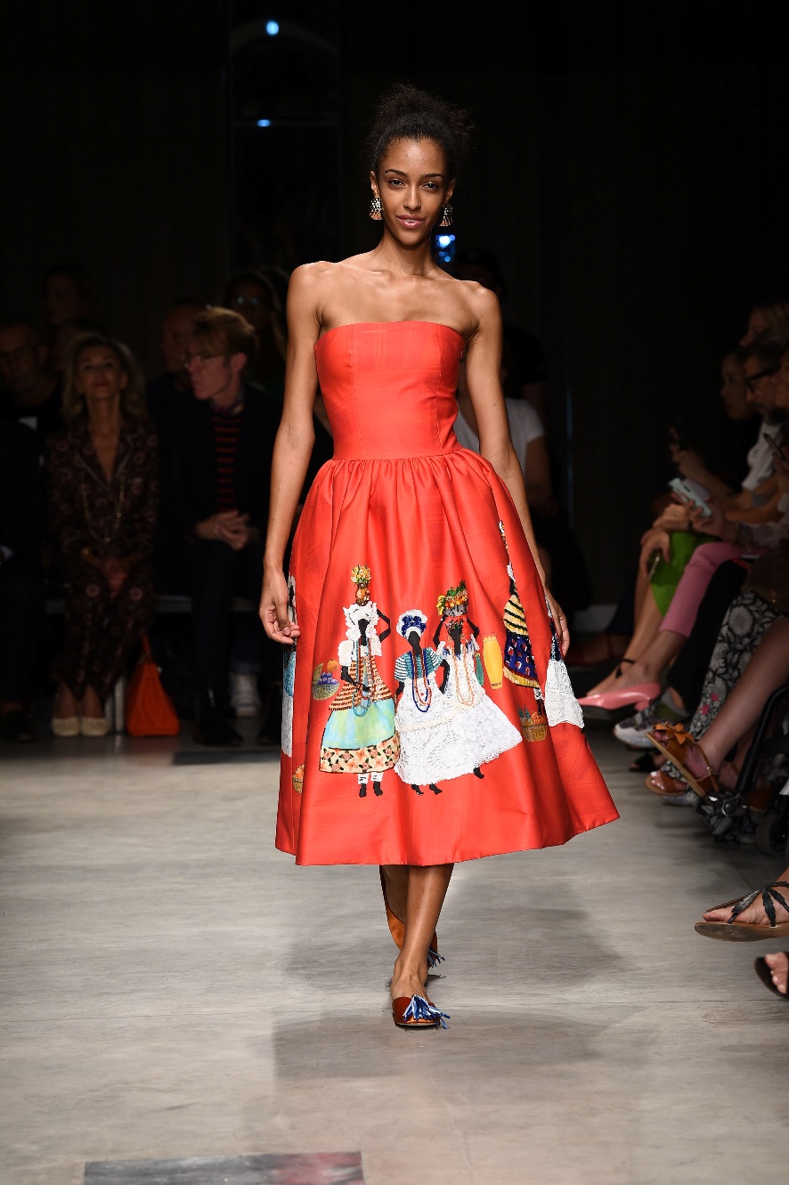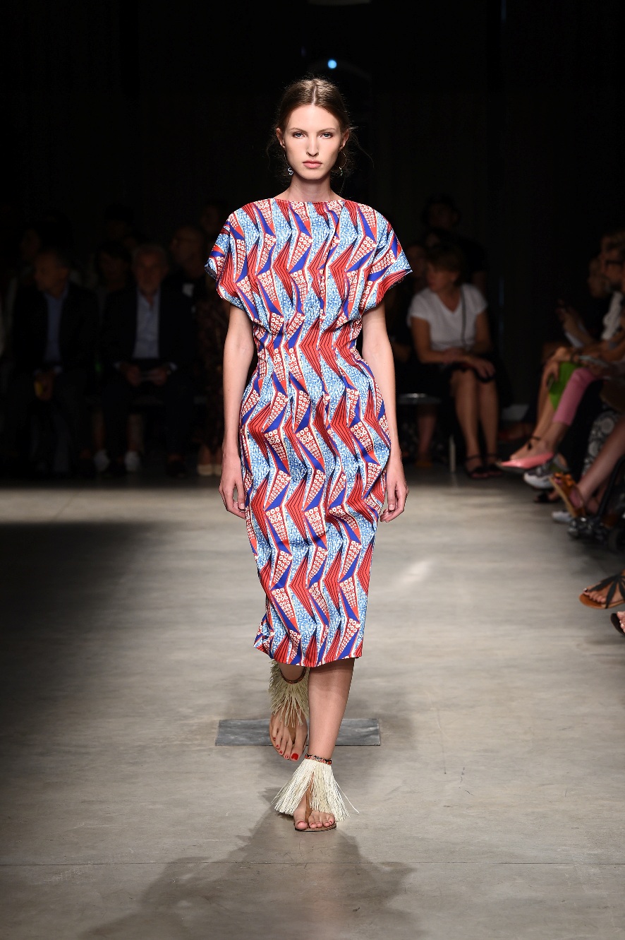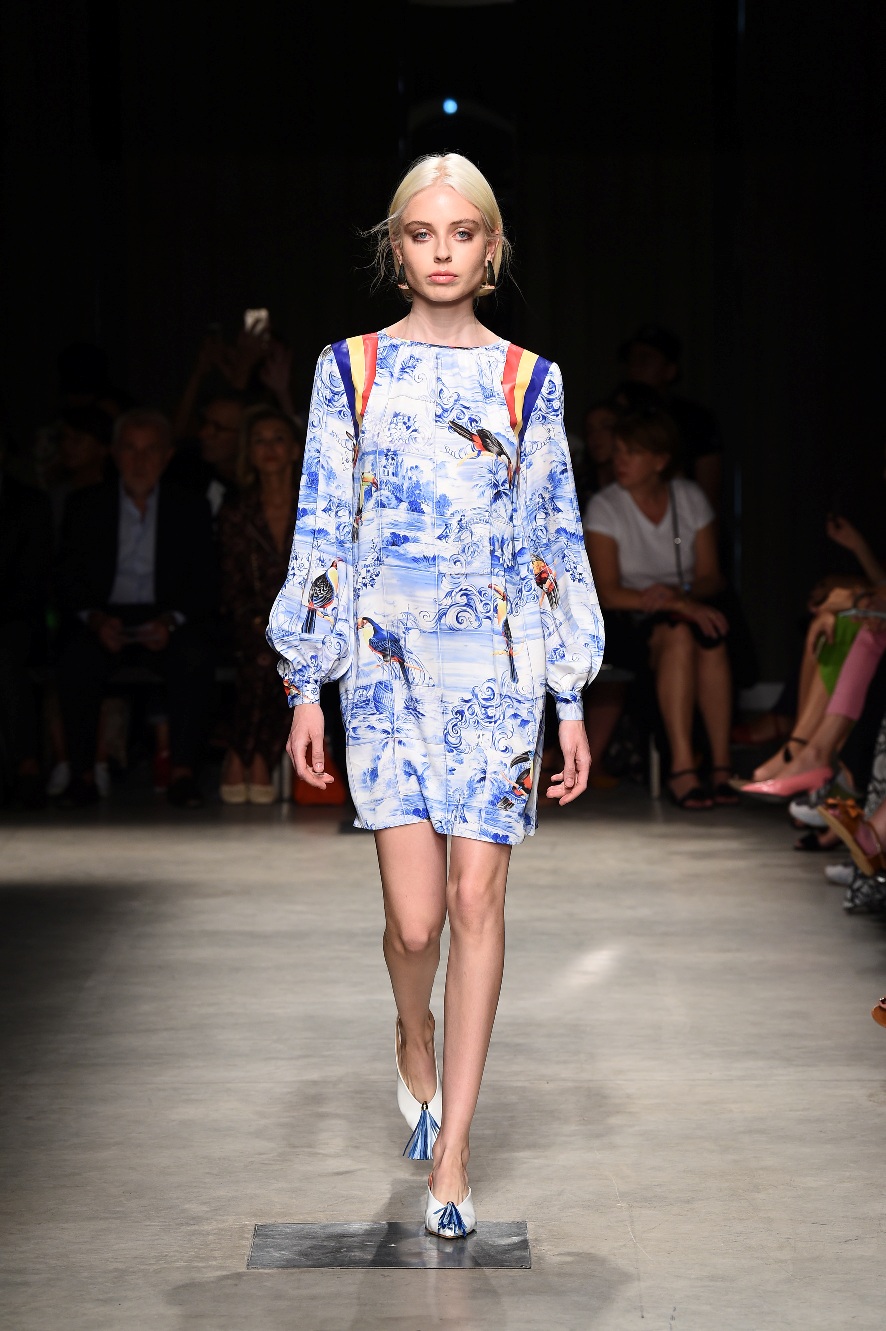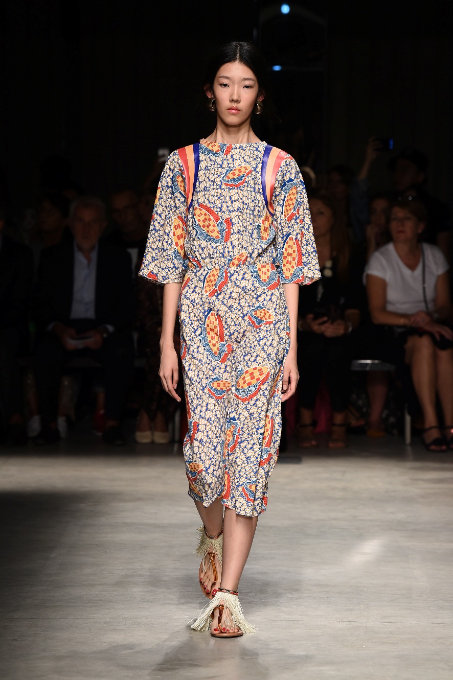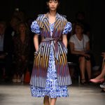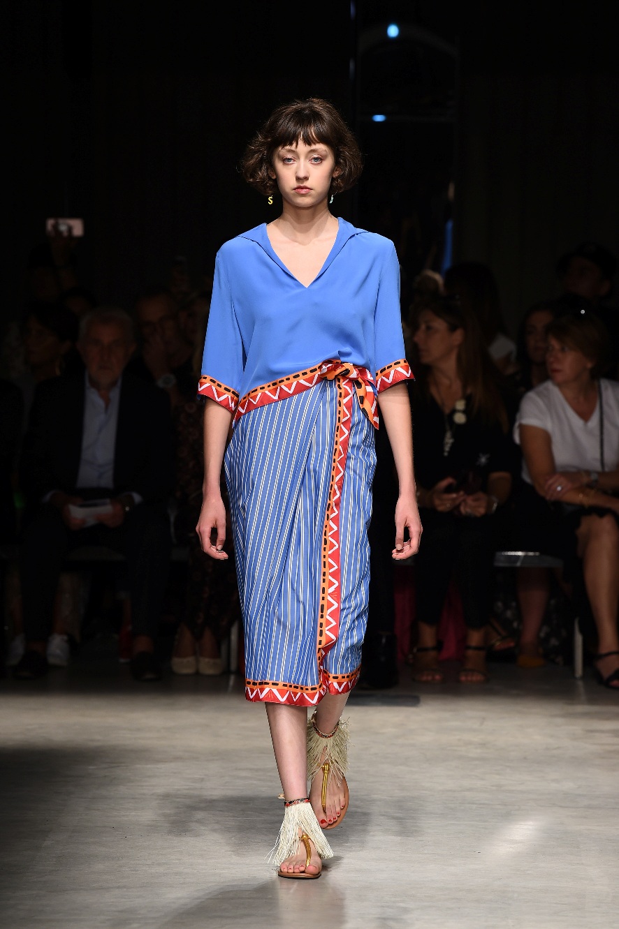 Attraverso il suo viaggio dal Benin al Brasile Stella Jean ha costruito una collezione lineare, coerente, fresca, giovanile, colorata, e come sempre multietnica dove si mescolano, in uno stesso capo, suggestioni e memorie di Paesi diversi, o si evidenziano i legami ancora vivi dopo secoli con la lontana terra di origine degli africani del Brasile. Troviamo così le gonne a balze tipiche di Bahia, completate dalle camicie di cotone -sempre presenti nelle sue collezioni- di taglio maschile, dalle maniche esagerate. I motivi degli azulejos portoghesi (piastrelle di ceramica con superficie smaltata, nella forma più antica, in blu), arricchiti da colorati pappagalli, sono stampati in colore azzurro su gonna di linea sirena completata da un top a quadri bianco e blu, un abitino corto, un completo –gonna plissettata e camicia morbida con piccolo collo a scialle e fiocco-; talvolta gli abiti hanno bordo a contrasto animalier. Il cotone bianco del Benin è impreziosito da due pappagalli coloratissimi ricamati/dipinti sulle voluminose maniche a sbuffo di una camicetta indossata con una gomma maxi. Ritroviamo il bianco nel lungo abito con un esagerato pappagallo ricamato su un fianco per tutta la lunghezza dell’abito. Accanto agli abiti decorati con scene di donne vestite con abiti di Bahia dipinti a mano e ricamati – come nell’abito bustier rosso e sulla voluminosa gonna rossa portata con un sopra singolare, composto da un largo nastro a motivi geometrici che si intreccia sul davanti e lascia le spalle scoperte, mentre un residuo di manica utilizza cotone a righe-, trovano posto le stampe optical; ed anche il pizzo sangallo nell’abito a balze con giacca rossa e in quello dalle spalle scoperte decorato da nastri con motivi geometrici. Interessante l’interpretazione del classico tranch in una versione moderna e allegra in tessuto a righe di colori diversi.