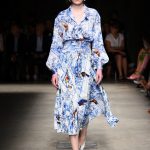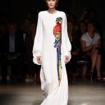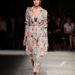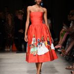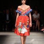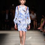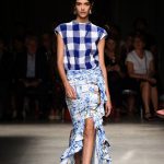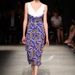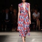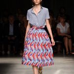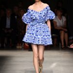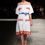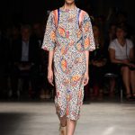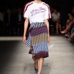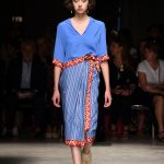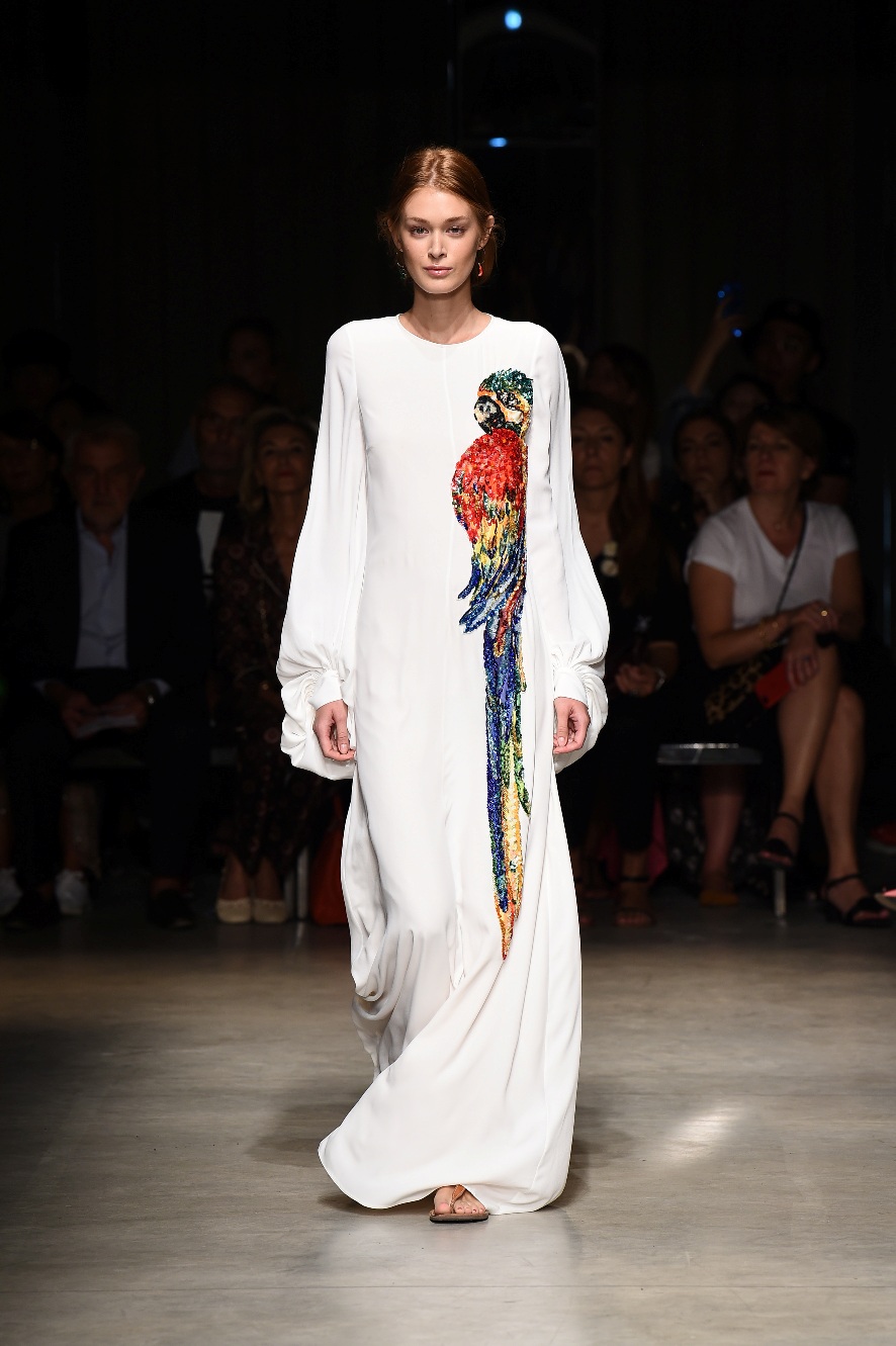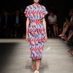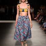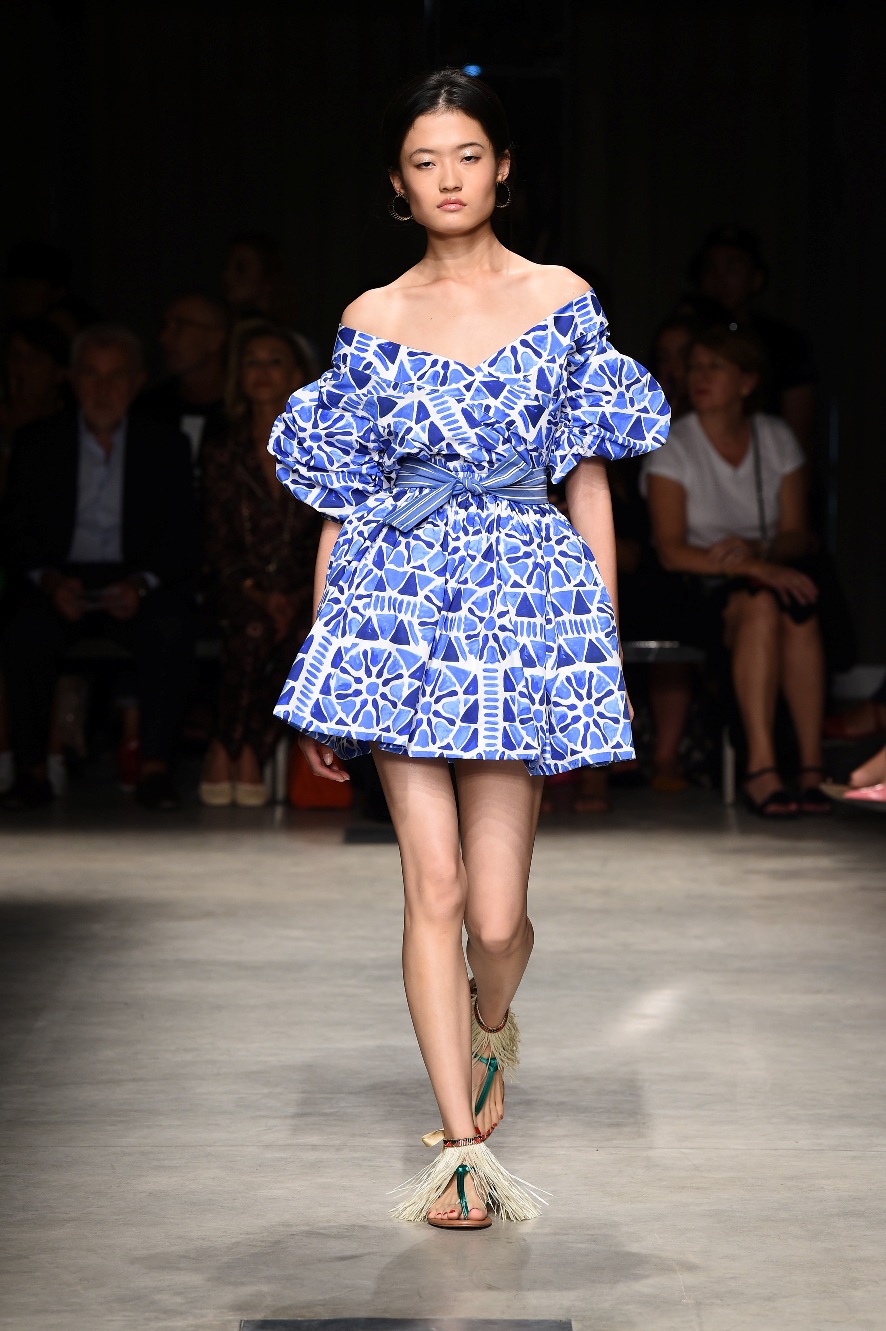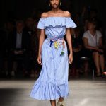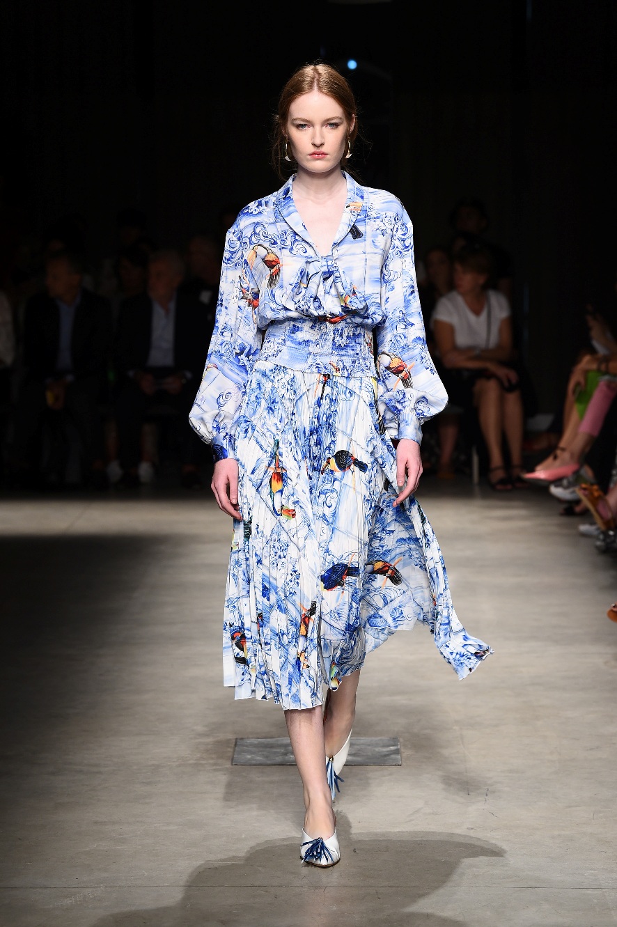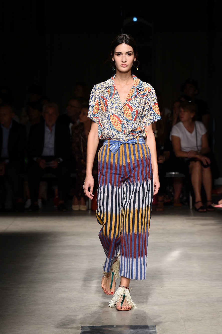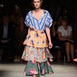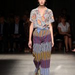 Attraverso il suo viaggio dal Benin al Brasile Stella Jean ha costruito una collezione lineare, coerente, fresca, giovanile, colorata, e come sempre multietnica dove si mescolano, in uno stesso capo, suggestioni e memorie di Paesi diversi, o si evidenziano i legami ancora vivi dopo secoli con la lontana terra di origine degli africani del Brasile. Troviamo così le gonne a balze tipiche di Bahia, completate dalle camicie di cotone -sempre presenti nelle sue collezioni- di taglio maschile, dalle maniche esagerate. I motivi degli azulejos portoghesi (piastrelle di ceramica con superficie smaltata, nella forma più antica, in blu), arricchiti da colorati pappagalli, sono stampati in colore azzurro su gonna di linea sirena completata da un top a quadri bianco e blu, un abitino corto, un completo –gonna plissettata e camicia morbida con piccolo collo a scialle e fiocco-; talvolta gli abiti hanno bordo a contrasto animalier. Il cotone bianco del Benin è impreziosito da due pappagalli coloratissimi ricamati/dipinti sulle voluminose maniche a sbuffo di una camicetta indossata con una gomma maxi. Ritroviamo il bianco nel lungo abito con un esagerato pappagallo ricamato su un fianco per tutta la lunghezza dell’abito. Accanto agli abiti decorati con scene di donne vestite con abiti di Bahia dipinti a mano e ricamati – come nell’abito bustier rosso e sulla voluminosa gonna rossa portata con un sopra singolare, composto da un largo nastro a motivi geometrici che si intreccia sul davanti e lascia le spalle scoperte, mentre un residuo di manica utilizza cotone a righe-, trovano posto le stampe optical; ed anche il pizzo sangallo nell’abito a balze con giacca rossa e in quello dalle spalle scoperte decorato da nastri con motivi geometrici. Interessante l’interpretazione del classico tranch in una versione moderna e allegra in tessuto a righe di colori diversi.