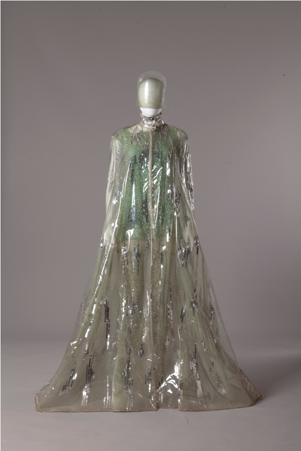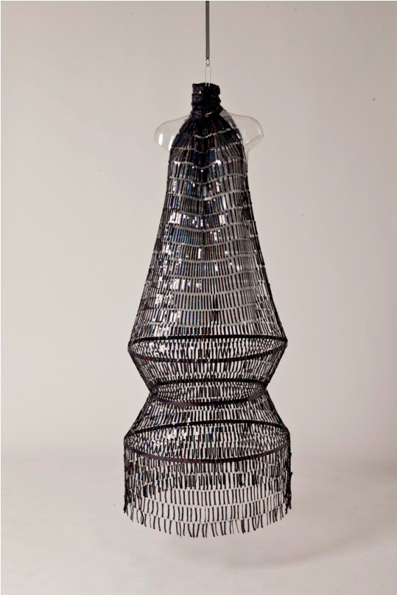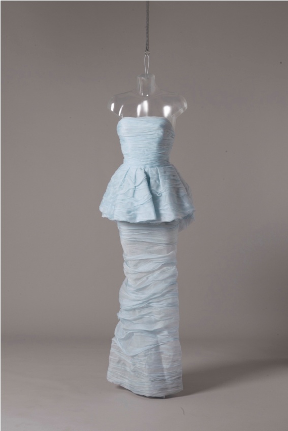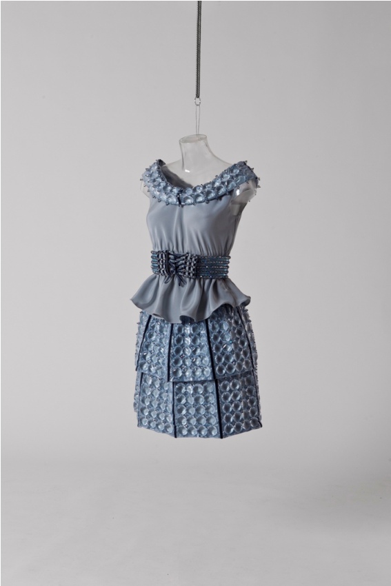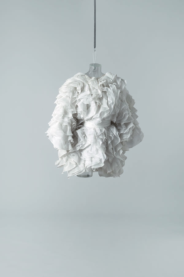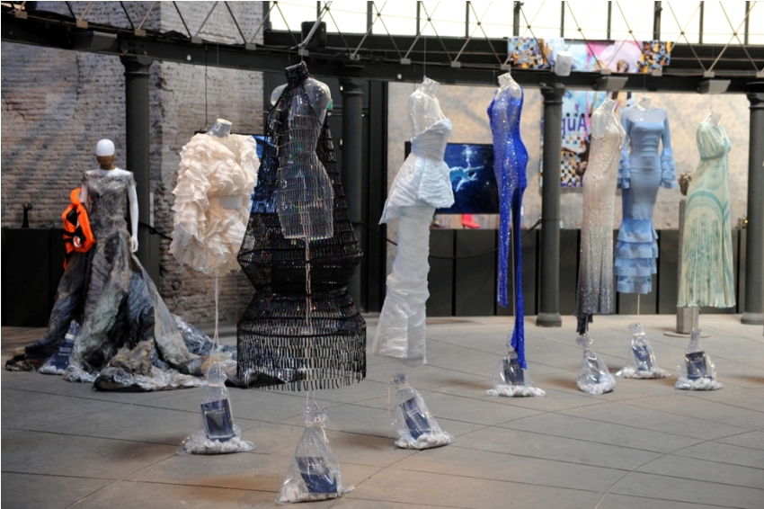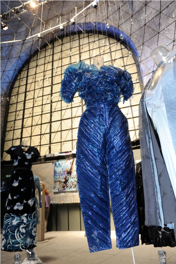 Una mostra circolare, come il luogo che la accoglie, come la “Regina dei rifiuti” -abito scultura- di Enrica Borghi troneggiante al centro della sala. Un suggestivo gioco di luci per un’atmosfera lunare. Un celeste che sfuma al lilla per poi stemperarsi sui toni rosati fende sfere di cristallo trasparente: sono le molecole di acqua sospese in aria che, come -fortunate stelle cadenti- calano tra le varie silhouette.