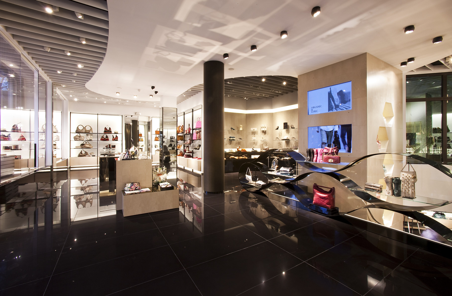 Al piano terra, un’ampia vetrata rivela un giardino d’inverno e una larga scalinata porta al piano inferiore dove i clienti possono sperimentare una esperienza esclusiva di shopping.