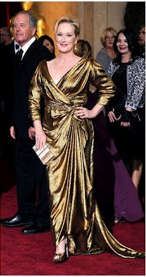 Ci par di vederla mentre si “indora” tutta – a partire dai capelli biondi elegantemente raccolti- per apprestarsi a calcare quel tappeto rosso che, proprio come un “fil rouge”, accomuna passato e presente, testimone di bellezza e di bravura. Sì, in un “monocromatico” perfetto, dalla testa ai piedi, a omaggiare il più nobile dei metalli e il più prezioso dei colori. Oro, come il sole, come il grano (lei è nata il 22 di giugno, in pieno solstizio estivo, ça va sans dire..). Oro, inattaccabile, simbolo di valore e di lealtà, definito come duttile, tenero, malleabile. Senza tempo. Dunque, nei suoi “anni d’oro”, quelli della piena maturità, quelli in cui ha dimostrato di essere all’altezza di ruoli “elevati” insieme ad altri più leggeri e disimpegnati, cosa scegliere se non lo splendore aureo, lo scintillio eclatante di una tinta che esalta la personalità di chi può osare senza auto-compiacimento? Di chi può permettersi di essere “corollario” di un corollario? D’altra parte si era presentata in mise “Prada” per la nomination de “Il diavolo veste Prada”, dimostrando un anticonformismo e una voglia di giocare davvero prorompenti! Non è da tutti….