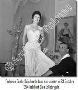 Quella di Schuberth, del resto, è una donna internazionale, iconica degli anni ’50: formosa ma con vita stretta, ricca ma inguaribilmente romantica. Le sue clienti furono soprattutto principesse e attrici, da Soraya (per cui si dice che realizzò un intero guardaroba regale nel giro di una notte) a Maria Pia di Savoia, da Rita Hayworth a Brigitte Bardot, da Ingrid Bergman a Silvana Mangano, per citare solo alcune delle tante che passarono per il suo atelier capitolino soprannominato “la quinta basilica di Roma”. Ma tra le sue creazioni più apprezzate vi furono pure le semplici vestagliette che fece indossare a Gina Lollobrigida in pellicole come “Pane, amore e fantasia”, “La provinciale”, “La romana”. Del resto l’attrice stessa dichiarò: “Fu lui a farmi diventare la Lollo nazionale, con il vitino da vespa e il seno all’italiana”.