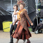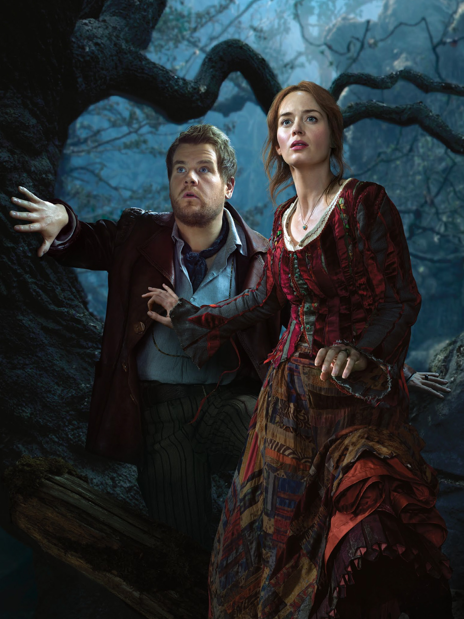 Infine, era necessario che la costumista dedicasse dello spazio anche alle illustrazioni classiche e senza tempo delle fiabe che hanno fornito lo spunto per l’unico mondo originale del film, quello del fornaio (James Corden) e di sua moglie (Emily Blunt). La loro funzione di collegamento tra tutte le storie è ben esemplificata dal costume di lei, completamente all’insegna del patchwork, dalla giacca con scollo tondo da cui spunta la camicia bianca, maniche lunghe svasate sul fondo ed allacciatura con bottoni molto piccoli sul davanti, formata da strisce alternate di porpora e di grigio asparago, fino alla gonna svasata lunga fino al polpaccio ed a più strati, costituita da tanti pezzi di diversi tessuti multicolore in varie tonalità di arancione, rosso, verde, blu e marrone, molto simile ad un costume folkloristico della tradizione europea. Per il fornaio, invece, la costumista ha ideato una giacca color rame, portata sopra la camicia bianca e con un fazzoletto blu notte legato attorno al collo, e dei pantaloni verde palude attraversati da sottili strisce verticali marroni.
