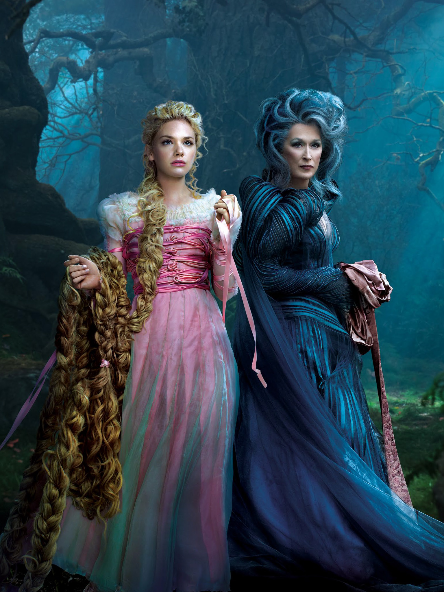 Nonostante per Raperonzolo ed il suo principe (Billy Magnussen) la costumista abbia scelto come ispirazione principale il Rinascimento, nei costumi finali sono presenti diversi altri influssi. Ispirandosi alla sua condizione di prigionia (la strega la tiene rinchiusa in una torre, finché il principe non scala i suoi lunghissimi capelli biondo dorato), la Atwood ha deciso di realizzare per lei una sorta di delicato ed etereo bondage: ha voluto rappresentare fisicamente la catena che la avvinghia alla madre e che deve spezzare per poter fuggire assieme al “cattivo ragazzo” che l’ha ammaliata. Ha avvolto il busto e le braccia della principessa in un complesso intreccio di nastri di raso rosa scuro, gli stessi che fermano i suoi lunghissimi capelli in una treccia: inizialmente la sua idea prevedeva addirittura di legare le braccia al corpo, ma ha dovuto cambiare idea perché l’attrice non avrebbe potuto muovere le braccia. Per rendere ancora più efficacemente l’idea della brava ragazza che si perde, per l’abito ha scelto il colore più dolce che si sia, il rosa, in una tonalità pallida e sbiadita; gli strati di crepe e taffetà di seta che formano la gonna sono stati coperti con un altro strato di organza sempre di seta tinta in un verde pallido, per attenuare la dolcezza dell’insieme e conferirgli una leggera dose di “oscurità” collegandolo quindi al tema della foresta, cercando di dare l’idea della luce filtrata dagli alberi. Uno scollo a barchetta di fine seta bianca arricciata e corte maniche a sbuffo dello stesso tessuto sono gli ultimi elementi di un costume che differisce notevolmente da quello della madre acquisita dal punto di vista sartoriale, ma che hanno un collegamento nell’originale elaborazione delle superfici dei tessuti. Inoltre, la scelta del colore e l’intero styling potrebbero sembrare un chiaro richiamo alla versione animata di questa principessa, protagonista del film Disney “Rapunzel – L’intreccio della torre” (2010, Nathan Greno e Byron Howard).