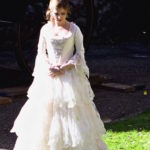 La stessa linea è stata seguita per il bianco abito da sposa, anche questo con un corpetto rigido dallo scollo tondo, da cui spunta dello chiffon, con un inserto sul centro con dei lacci intrecciati color blu chiaro; maniche a tre quarti che terminano con cascate di delicatissimo pizzo, lo stesso tessuto delle balze della vaporosa ma contenuta gonna. Con i capelli sempre acconciati in un’alta e morbida coda di cavallo ed una piccola coroncina bianca come tocco finale a sostituire quella oro scuro del ballo, scambiando però la sottile ma preziosa collana sempre oro scuro con dei discreti ma pregiati orecchini pendenti anch’essi bianchi.