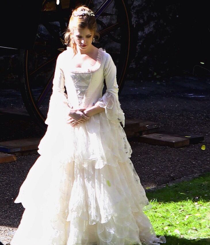 Anna Kendrick fotografata sul set del film con indosso l'abito da sposa di Cenerentola