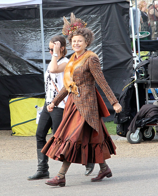 Tra gli altri mondi esplorati dalla Atwood si annovera l’epoca vittoriana, attraverso la vicenda di Jack (Daniel Huttlestone) che, con il suo maglione a maniche lunghe ed a strisce irregolari in grigio e verde cinabro, i pantaloni lunghi verde palude che stracciati diventano verde cinabro con sfilacci color ambra, la sciarpa di lana verde cacciatore e la coppola dello stesso colore, non starebbe fuori posto nella Londra di Charles Dickens. Così come sua madre (Tracey Ullman) con il suo abito marrone lungo fino al polpaccio, con tasconi, scollo tondo e spalline larghe, portato con sotto una leggera camicia bianca, sporca e con le maniche arrotolate ed un foulard beige, lavanda blu e melanzana annodato attorno al collo. Anche il suo abbigliamento una volta diventata ricca potrebbe essere quello di una donna inglese di campagna, per quanto maggiormente grottesco, dal vistoso copricapo di piume di fagiano alla stola di volpe attorno al collo, dalla redingote in tweed arancione e marrone foderata in arancione alla gonna mogano lunga fino al polpaccio con balza sul fondo.