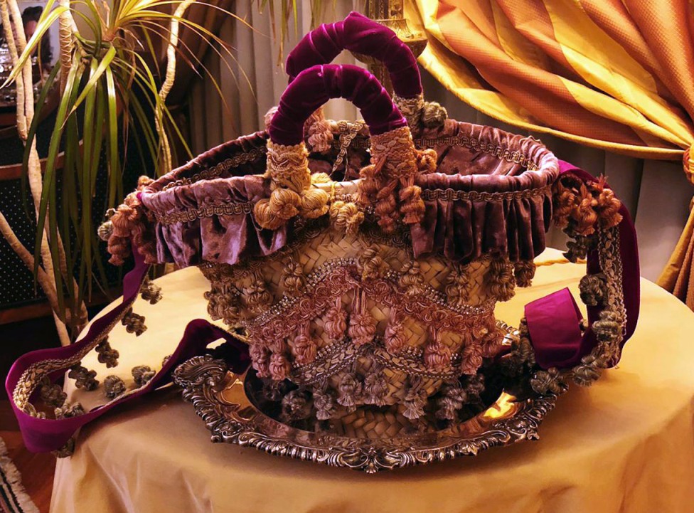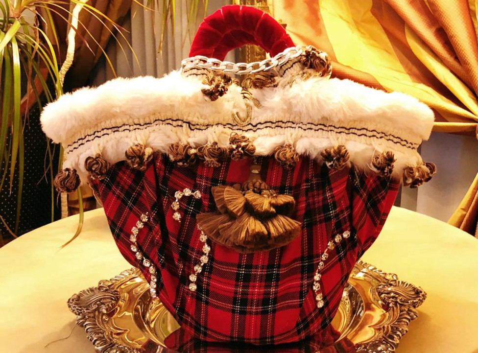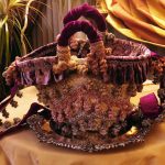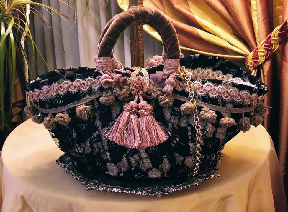L’estrosità e la fantasia del decorativismo siciliano comunque non giocano solo su sfumature accese ma sanno anche distinguersi per ricchezza e sontuosità, e Susanna le abbina a tutto il lusso e allo sfarzo appariscente e carico dello stile baroccheggiante per un’inedita coffa da sera.