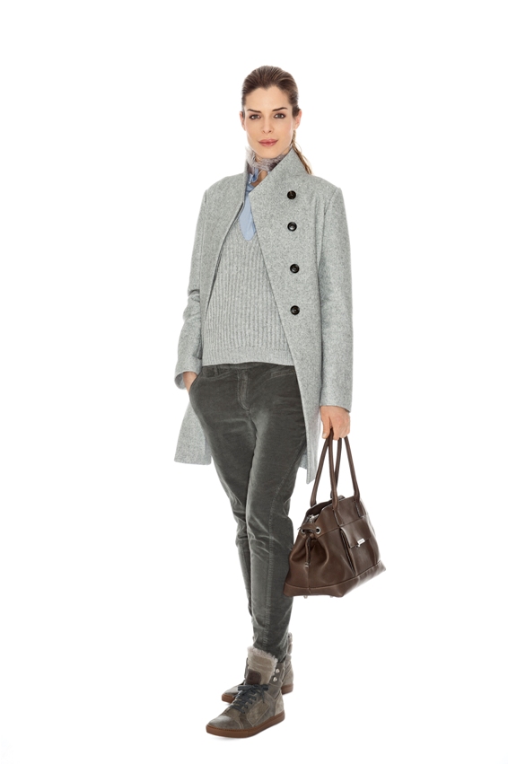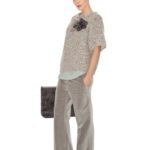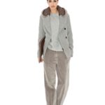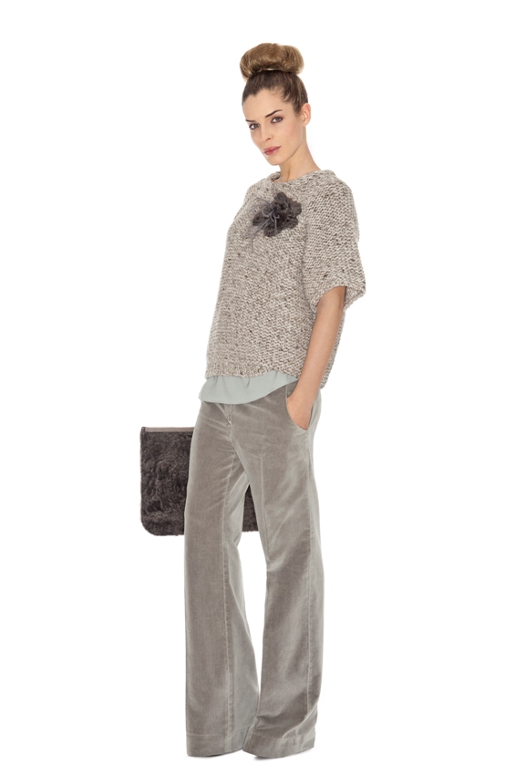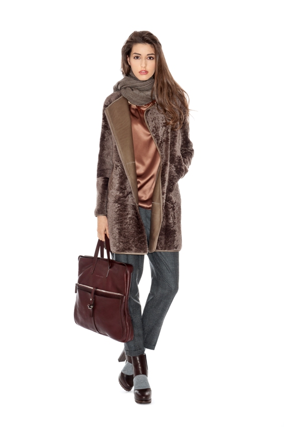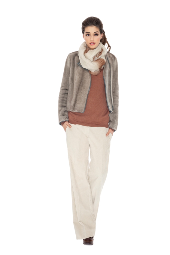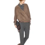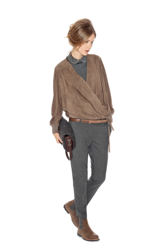 Un accenno agli accessori che chiudono il total look Cucinelli: guanti, sciarpe e bijoux; segnaliamo i colletti, anche piccoli e con pailette per completare spiritosamente una mise. Le borse sono realizzate in nappa doppiata in flanella, cavallino ed anche in pitone. Le scarpe rappresentano il pezzo di rottura, quel rustico che accompagna un capo chic, anfibi, motorbike, sneakers, scrape dal tacco largo ma, anche le più modaiole zeppe.