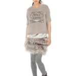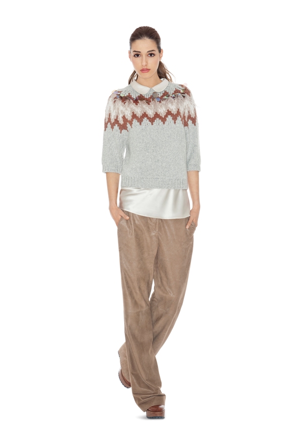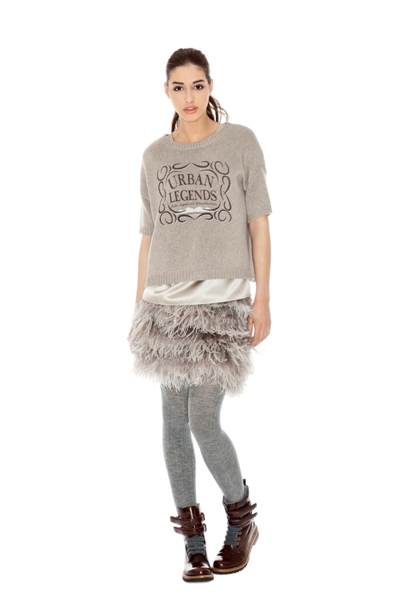 E’una collezione più femminile del solito: al rustico chic di sempre sono aggiunti tanti tocchi di femminilità riscontrabili nelle suggestioni un po’ retrò degli anni venti; ottenute ad esempio con il marabù che completa come fosse una frangia le manichine; ma il marabù, dettaglio chic, arricchisce una “rustica” felpa, abbinata ad un abito iperfemminile in raso di seta. Ancora marabù sui bijoux e questi diventano un colletto. Una gonna con le frange in pieno stile charleston è abbianabile a una giovanile t-shirt e a rusticissimi anfibi.