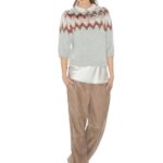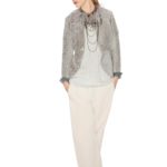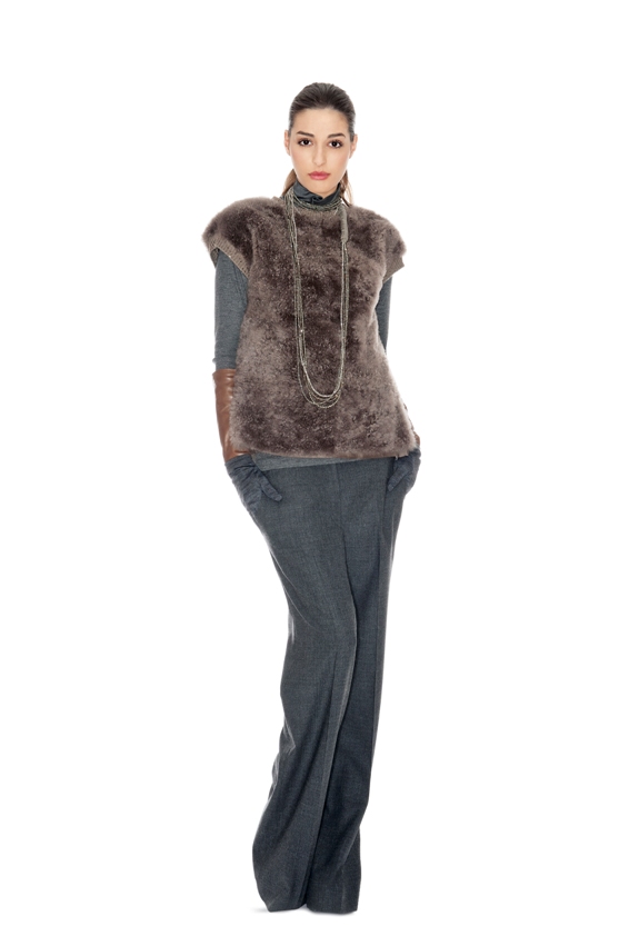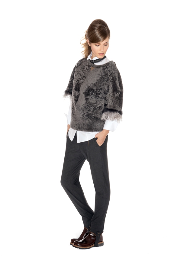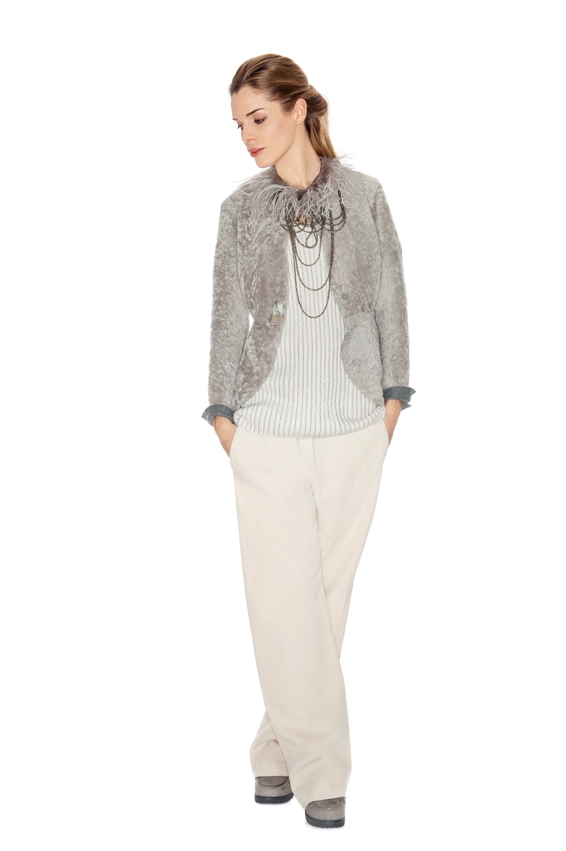 Notiamo ancora la forte presenza della pelliccia, anche lavorata a tricot: capo intero o semplicemente come decorazioni di altri capi, o ancora “fodera” di capo di maglieria. Le pellicce vanno dal montone tradizionale, all’agnellino del Chekiang, al marabù, alla pelliccia cashmere, soffice al tatto, caldissima e leggera facile da portare. Ci è sembrato ridondante l’uso di due tipi di pelo su uno stesso capo.