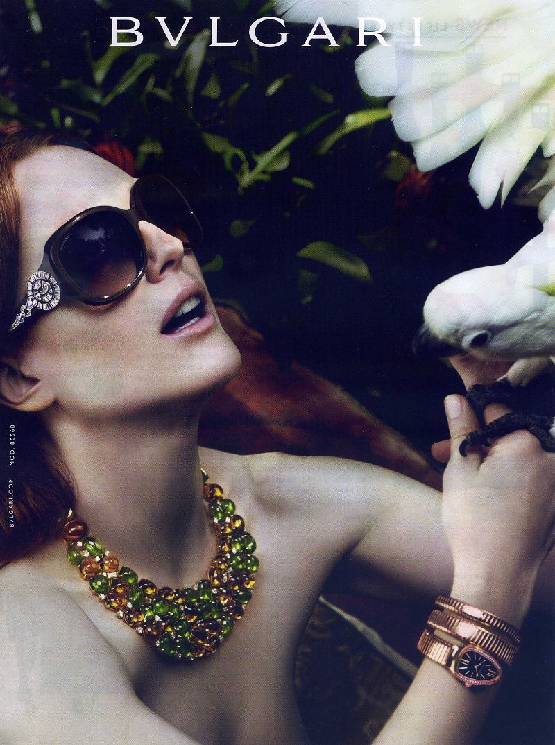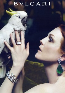 Altri tempi e altre storie. Il dato curioso dei nostri giorni, è che un’attrice di quasi cinquant’anni, a circa mezzo secolo di distanza, abbia la voglia e l’ironia di riprovare a interpretare un sogno. Julianne Moore, nata il 3 dicembre 1960, posa senza abiti ma con molti accessori (gioielli e borse), per la campagna Bulgari “Eccentric Charisma”. Se sono irrimediabilmente finiti i tempi delle “Colazioni da Tiffany”, una “Merenda da Bulgari” non ci dispiacerebbe affatto”¦