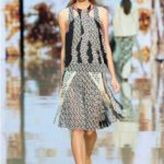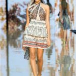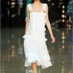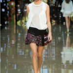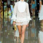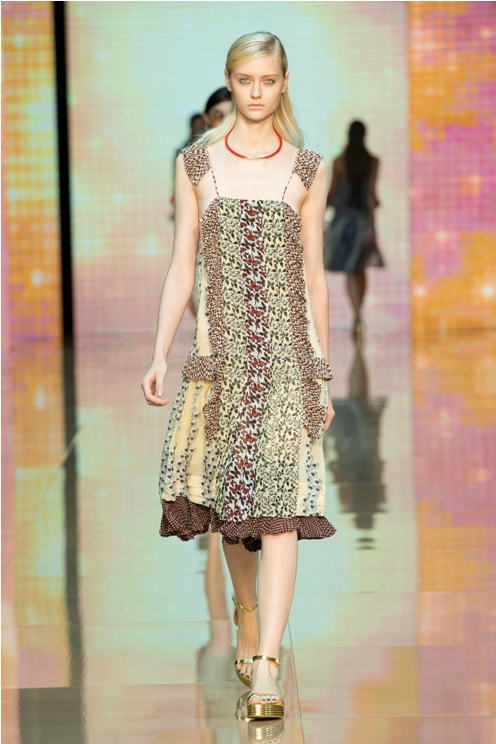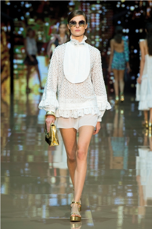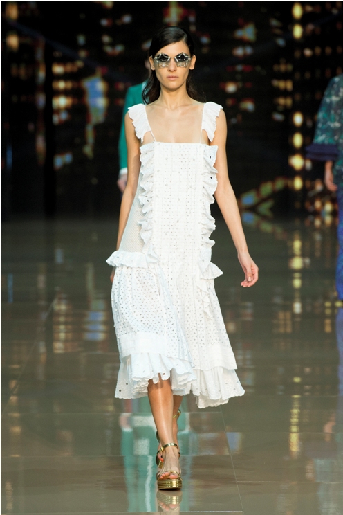 Giovanili e spiritosi ci sono sembrati l’abito bianco in sangallo lungo a metà polpaccio doppia gonna e rouche ai fianchi e lungo il corpino -che ritroviamo in altri abiti stampati- e quello corto con lo sparato, come gli occhiali a forma di margherita. Come abbiamo detto le fantasie sono tante e si mescolano su uno stesso abito, sono minuscole margherite, cuori, gigli e piccole farfalle, righe; rendono bene nei mini dress a balze annodati al collo che rievocano atmosfere estive di feste in riva al mare.