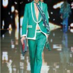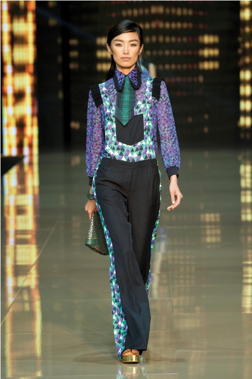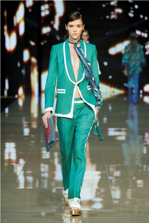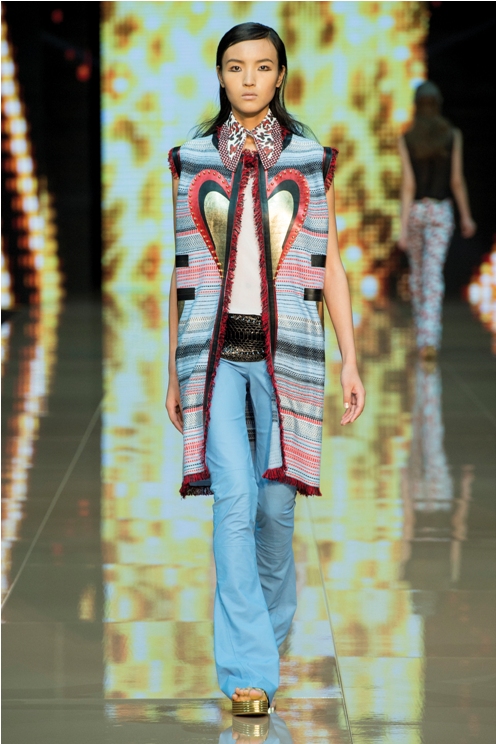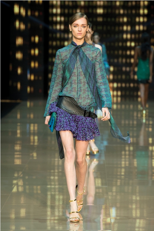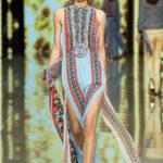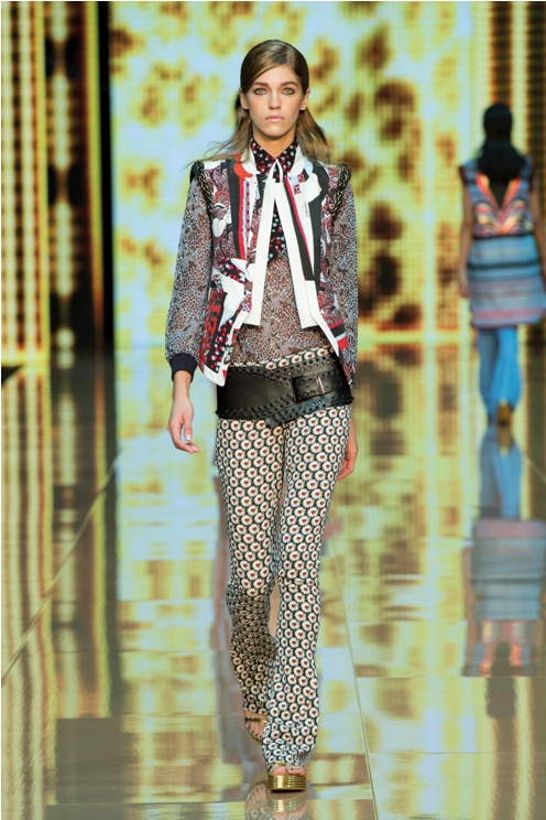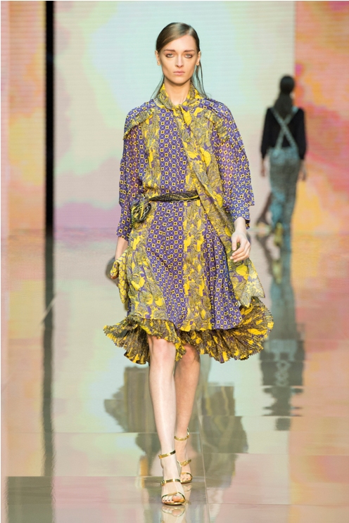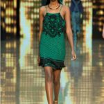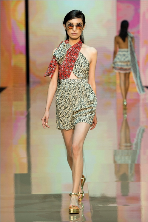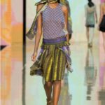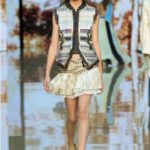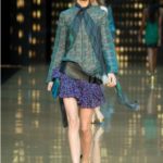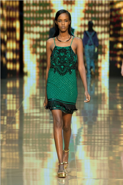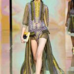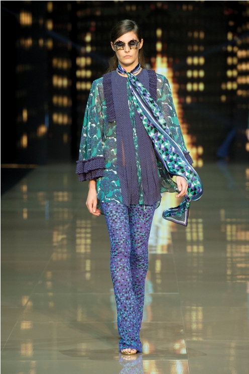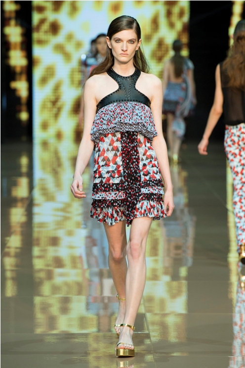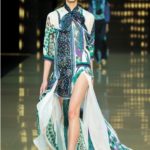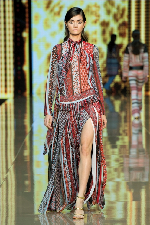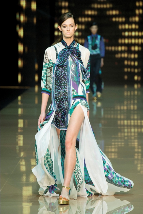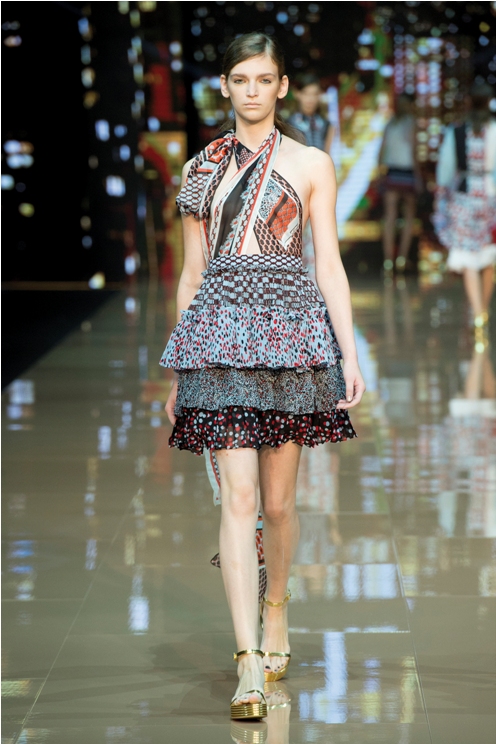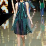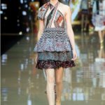 Pochi sono i capi che si fanno ammirare. Un abito lungo nei toni bianchi celesti e verdi ci ha fatto pensare, ma l’accostamento riconosciamolo è azzardato -i due abiti non hanno elementi in comune- una precedente splendida creazione di Roberto Cavalli che si era ispirato alle porcellane cinesi di epoca Ming. Usando un termine televisivo potremmo dire che il format di questo abito – stoffa leggera che movimenta l’abito e la figura, profondi spacchi, ecc- si ripete su altri, ma sovrapposizioni di stampe diverse e certe “soverchiature di orpelli” –come una rouche plissettata sovrapposta alla gonna all’altezza dei fianchi-, complicano la semplicità della linea, e l’abito che ne risulta non è né elegante né bello, per ritornare alla citazione di Gaudì. La rouche plissettata, -più o meno lunga, fino a diventare una gonnellina nera sempre plissettata sovrapposta alla gonna-, si ripete anche su abiti corti, ma non se ne comprende il significato, non serve a completare il discorso; è un vezzo inutile.