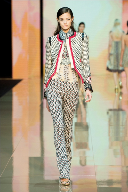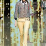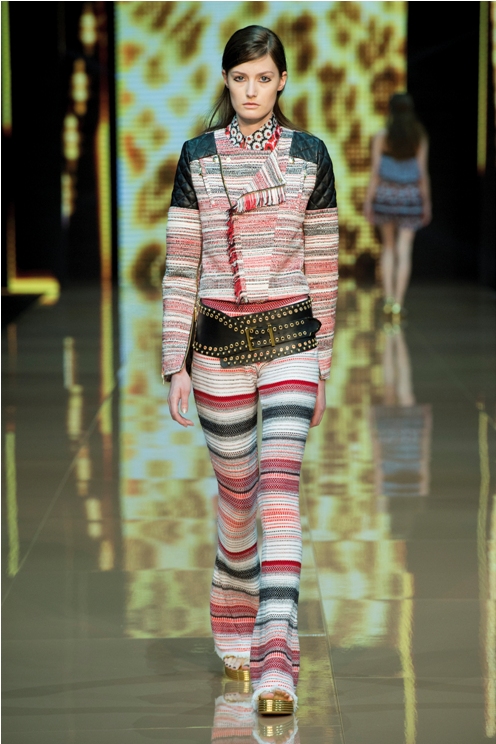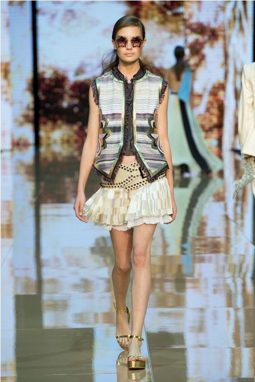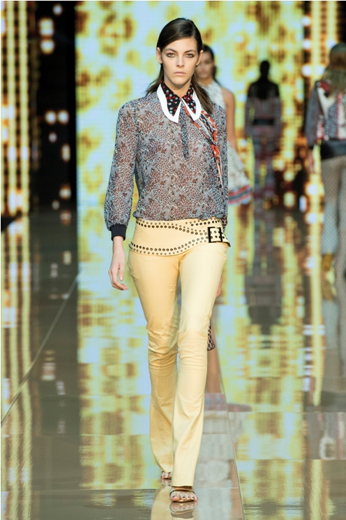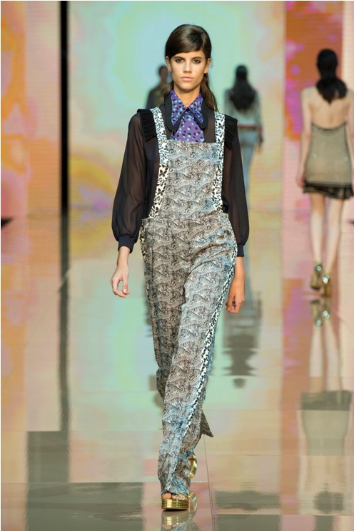 Alti cinturoni poggiati sui fianchi e borchiati accompagnano i pantaloni slim stampati e fasciatissimi ma a zampa e le gonne cortissime. Le borse ripetono le stampe degli abiti e i sandali sono in oro: unici elementi di lineare semplicità.