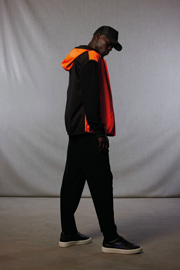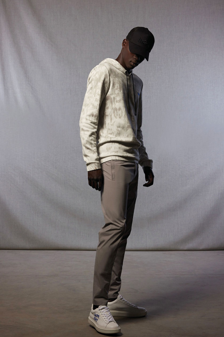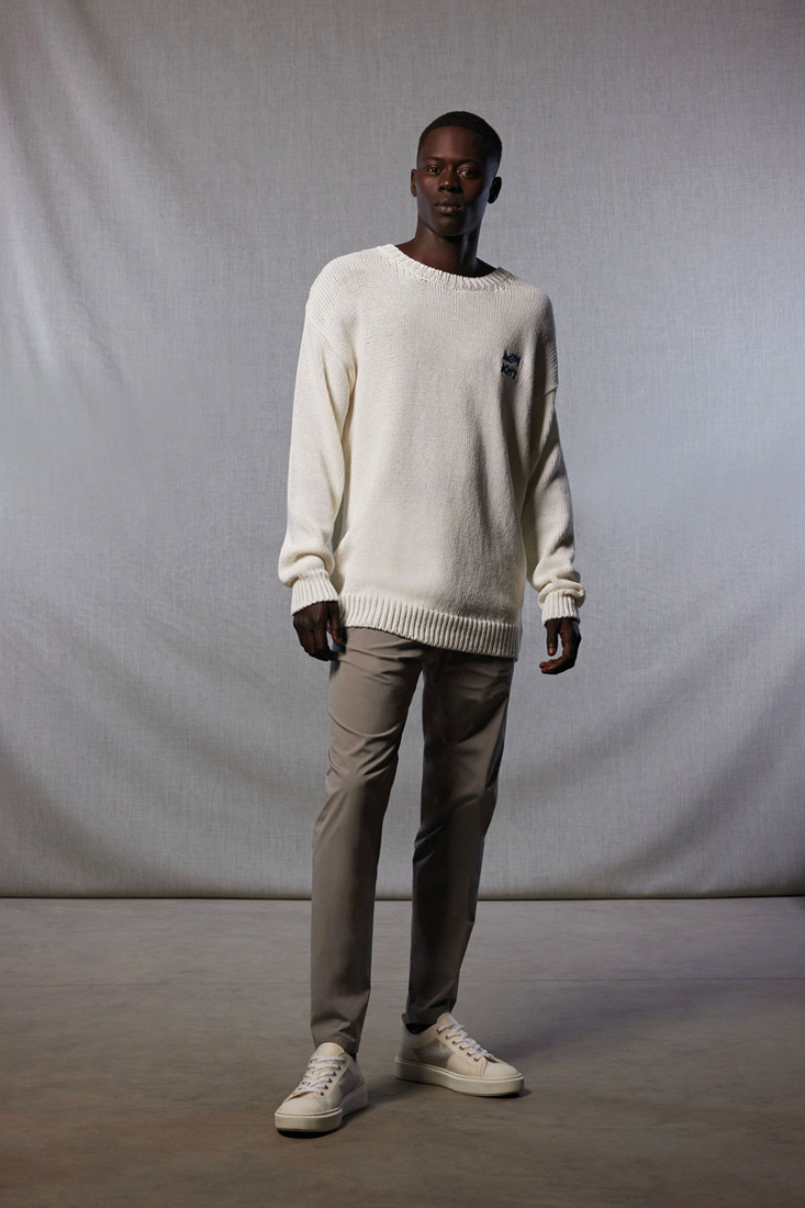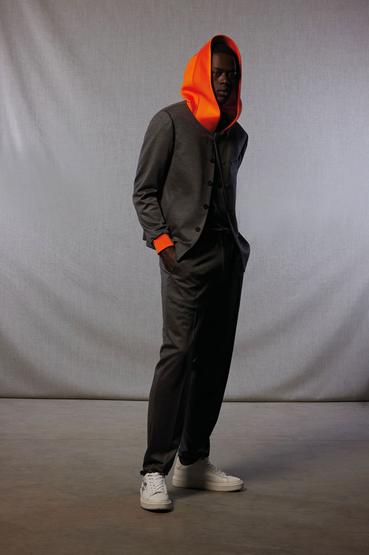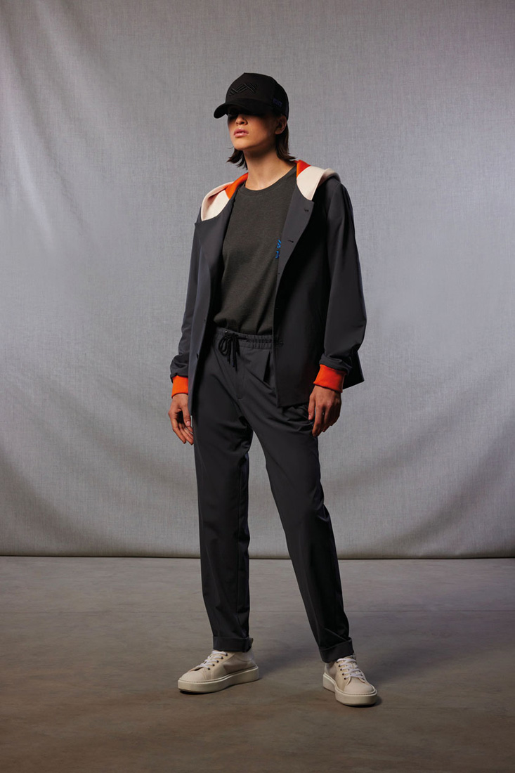 Una collezione giovane, dinamica, dallo stile rilassato e volumi ampi, dove dominano la felpa con cappuccio e tanti dettagli chiaramente dallo streetwear: la coulisse o l’elastico in vita sui pantaloni di linea formale, il cappuccio per le felpe, il cappello da baseball, e le sneaker.